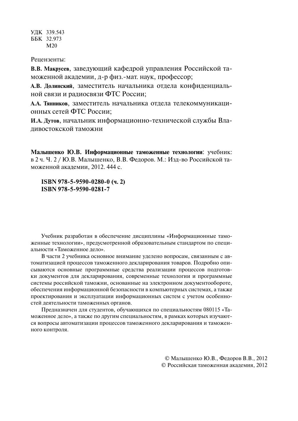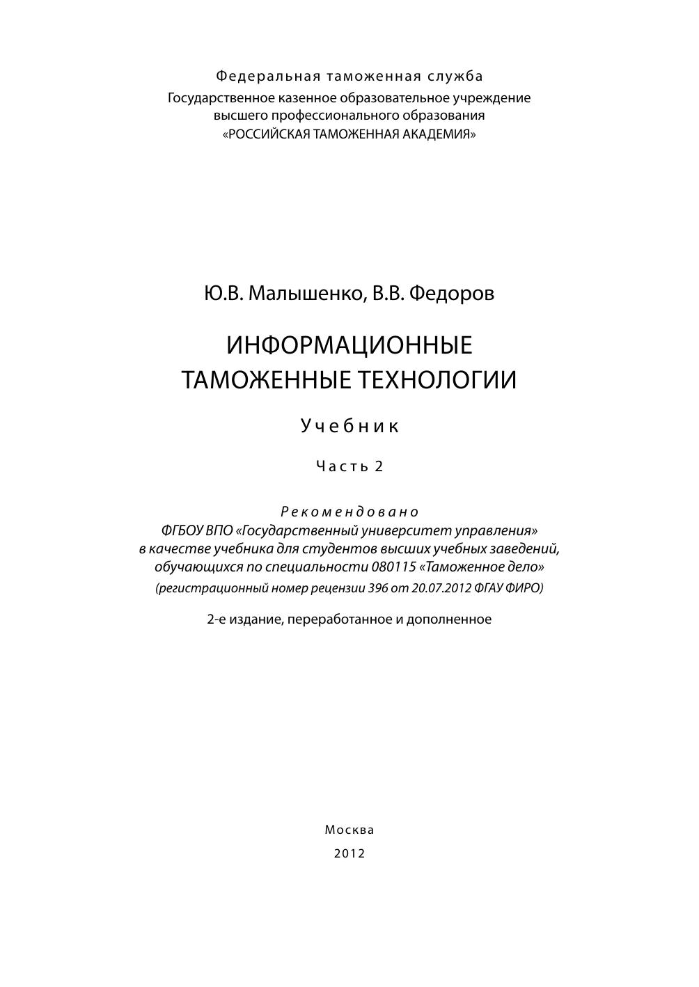 В части 2 учебника основное внимание уделено вопросам, связанным с автоматизацией процессов таможенного декларирования товаров. Подробно описываются основные программные средства реализации процессов подготовки документов для декларирования, современные технологии и программные системы российской таможни, основанные на электронном документообороте, обеспечения информационной безопасности в компьютерных системах, а также проектирования и эксплуатации информационных систем с учетом особенностей деятельности таможенных органов. Предназначен для студентов, обучающихся по специальностям 080115 «Таможенное дело», а также по другим специальностям, в рамках которых изучаются вопросы автоматизации процессов таможенного декларирования и таможенного контроля.