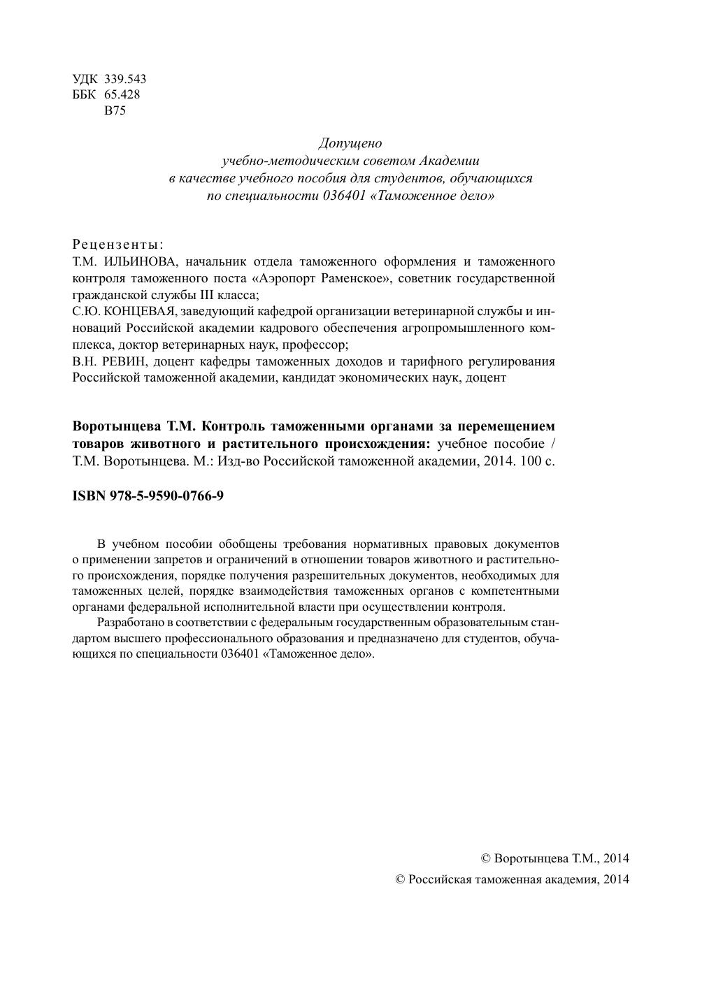 Контроль таможенными органами за перемещением товаров животного и растительного происхождения: учебное пособие