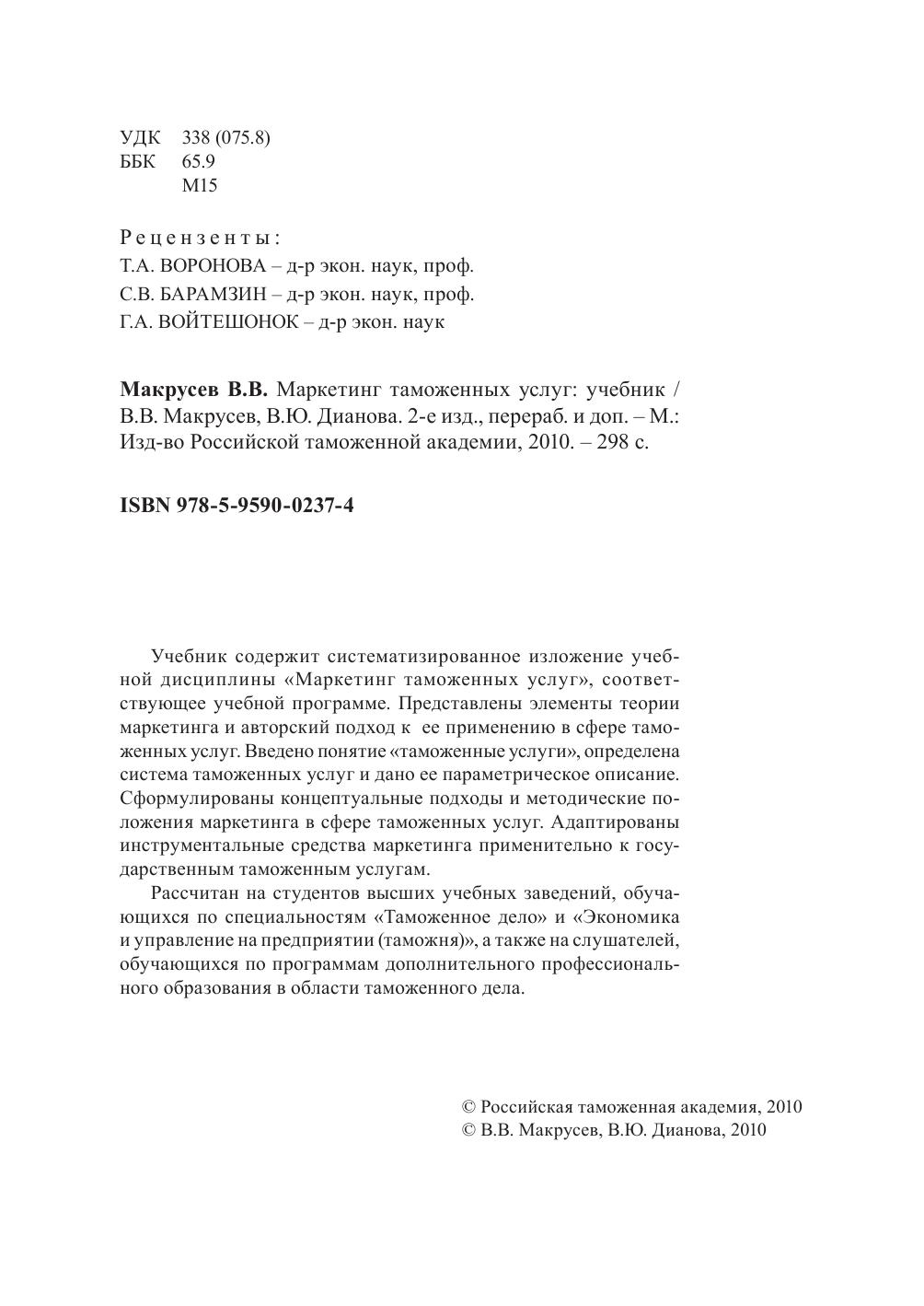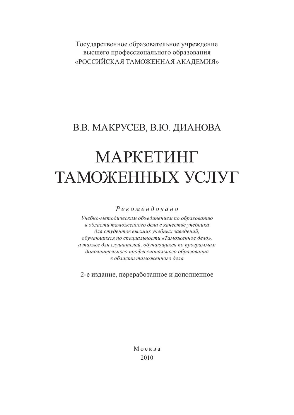Учебник содержит систематизированное изложение учебной дисциплины «Маркетинг таможенных услуг», соответствующее учебной программе. Представлены элементы теории маркетинга и авторский подход к ее применению в сфере таможенных услуг. Введено понятие «таможенные услуги», определена система таможенных услуг и дано ее параметрическое описание. Сформулированы концептуальные подходы и методические положения маркетинга в сфере таможенных услуг. Адаптированы инструментальные средства маркетинга применительно к государственным таможенным услугам. Рассчитан на студентов высших учебных заведений, обучающихся по специальностям «Таможенное дело» и «Экономика и управление на предприятии (таможня)», а также на слушателей, обучающихся по программам дополнительного профессионального образования в области таможенного дела.