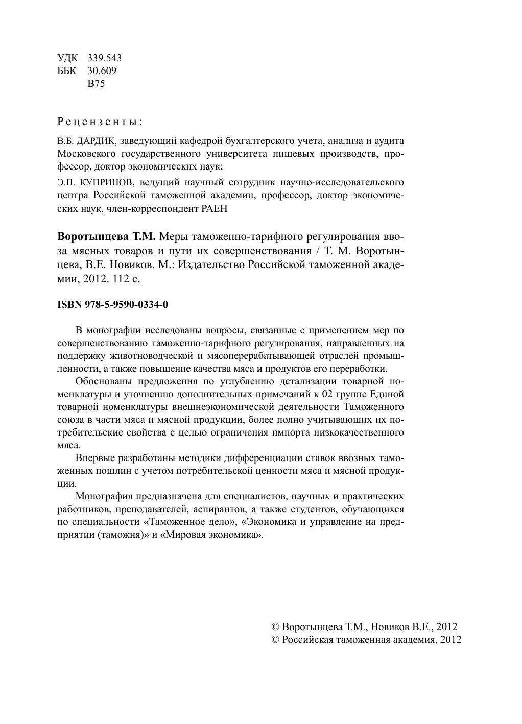 В монографии исследованы вопросы, связанные с применением мер по совершенствованию тамо женно-тарифного регулирования, направленных на поддержку животноводческой и мясоперерабатывающей отраслей промышленности, а также повышение качества мяса и продуктов его переработки. Обоснованы предложения по углублению детализации товарной номенклатуры и уточнению дополнительных примечаний к 02 группе Единой товарной номенклатуры внешнеэкономической деятельности Таможенного союза в части мяса и мясной продукции, более полно учитывающих их потребительские свойства с целью ограничения импорта низкокачественного мяса. Впервые разработаны методики дифференциации ставок ввозных таможенных пошлин с учетом потребительской ценности мяса и мясной продукции. Монография предназначена для специалистов, научных и практических работников, преподавателей, аспирантов, а также студентов, обучающихся по специальности «Таможенное дело», «Экономика и управление на предприятии (таможня)» и «Мировая экономика».