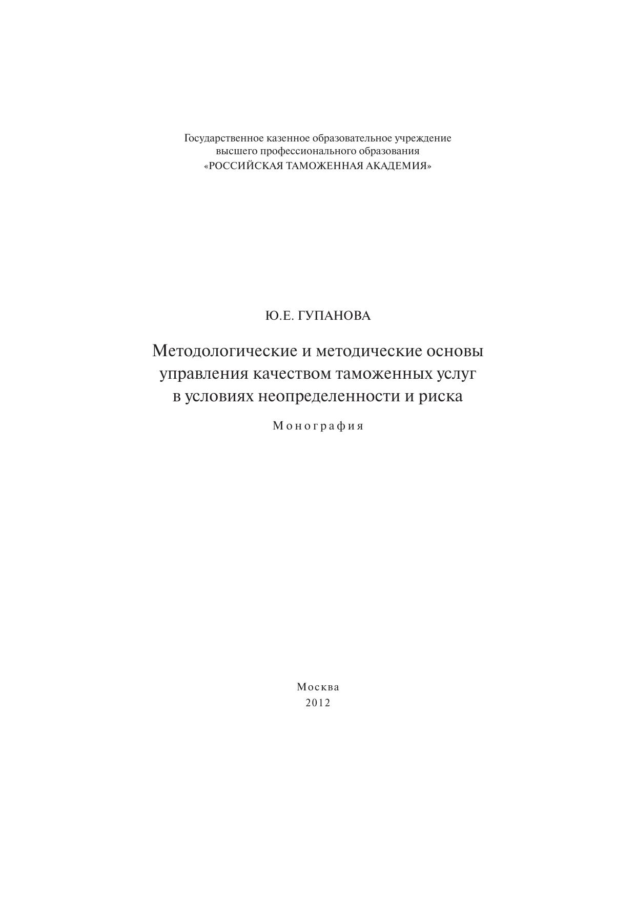 Методологические и методические основы управления качеством таможенных услуг в условиях неопределенности и риска: монография