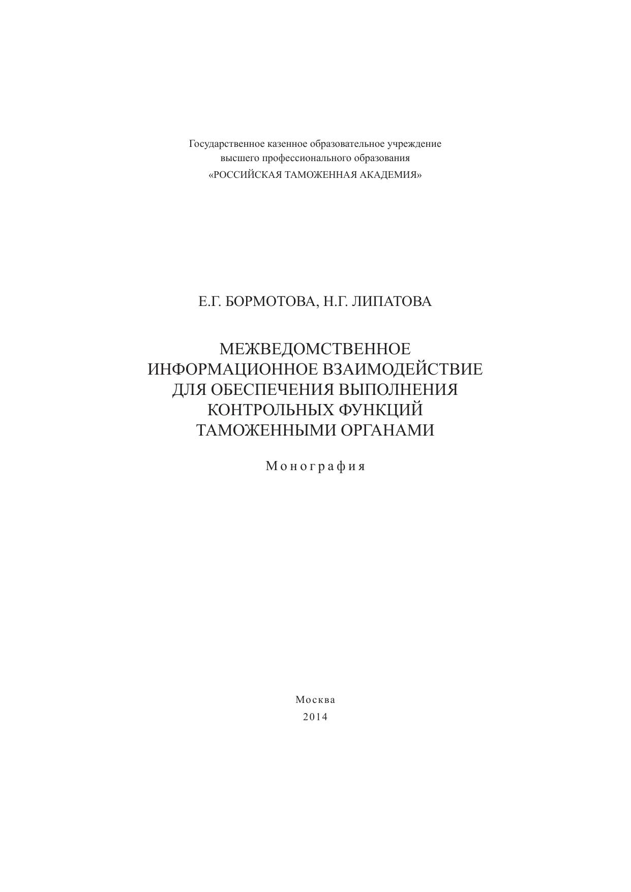 Межведомственное информационное взаимодействие для обеспечения выполнения контрольных функций таможенными органами: монография