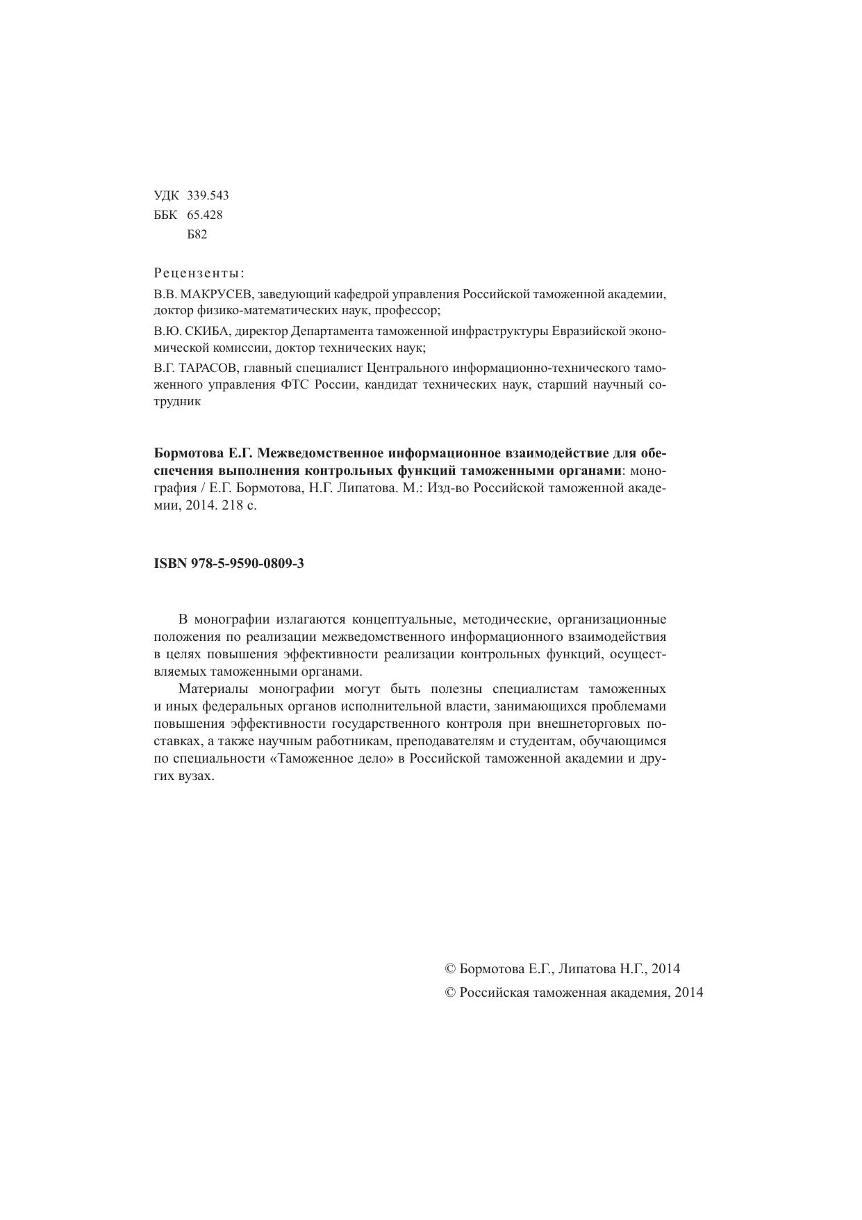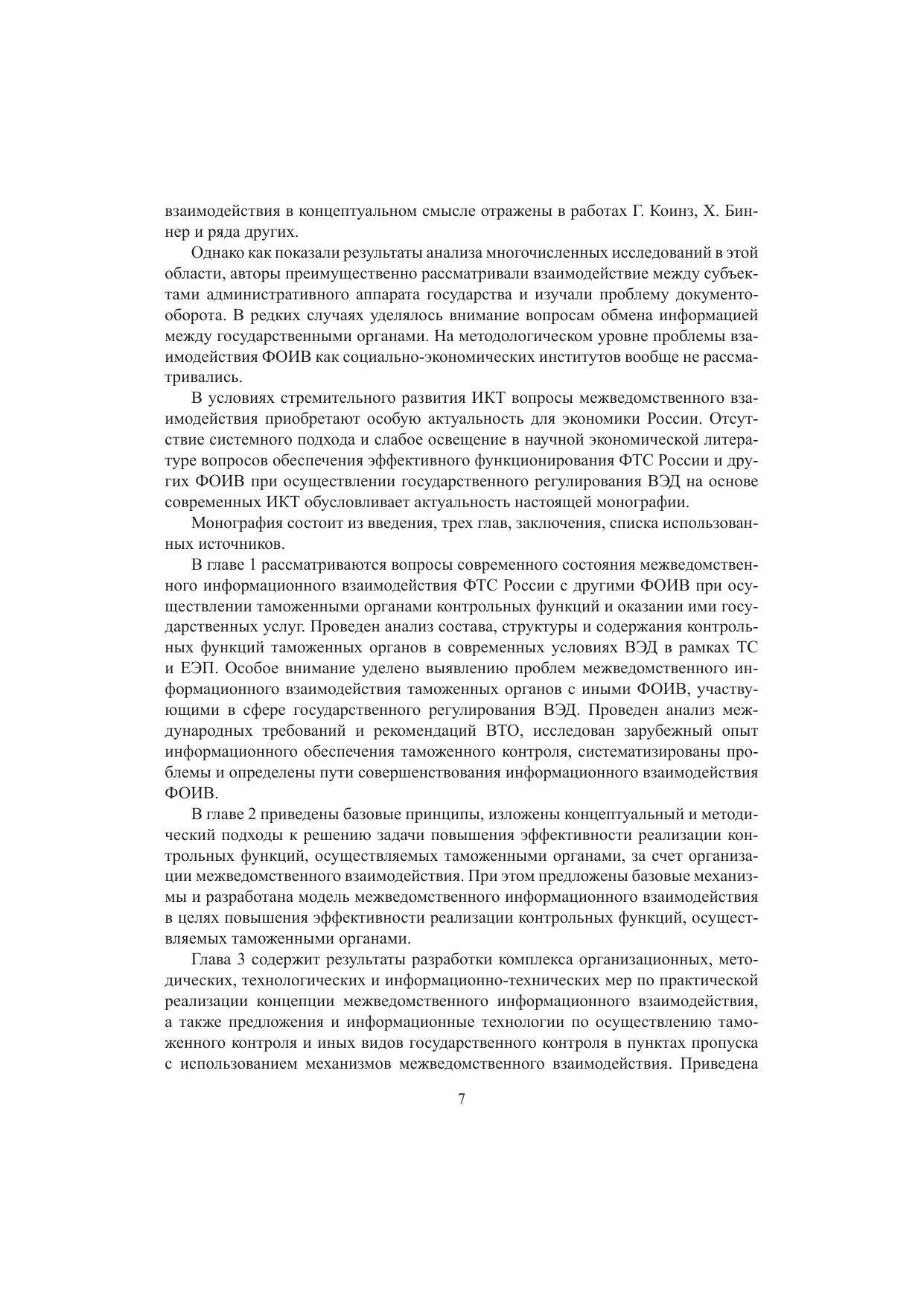 В монографии излагаются концептуальные, методические, организационные положения по реализации межведомственного информационного взаимодействия в целях повышения эффективности реализации контрольных функций, осуществляемых таможенными органами. Материалы монографии могут быть полезны специалистам таможенных и иных федеральных органов исполнительной власти, занимающихся проблемами повышения эффективности государственного контроля при внешнеторговых поставках, а также научным работникам, преподавателям и студентам, обучающимся по специальности «Таможенное дело» в Российской таможенной академии и других вузах.