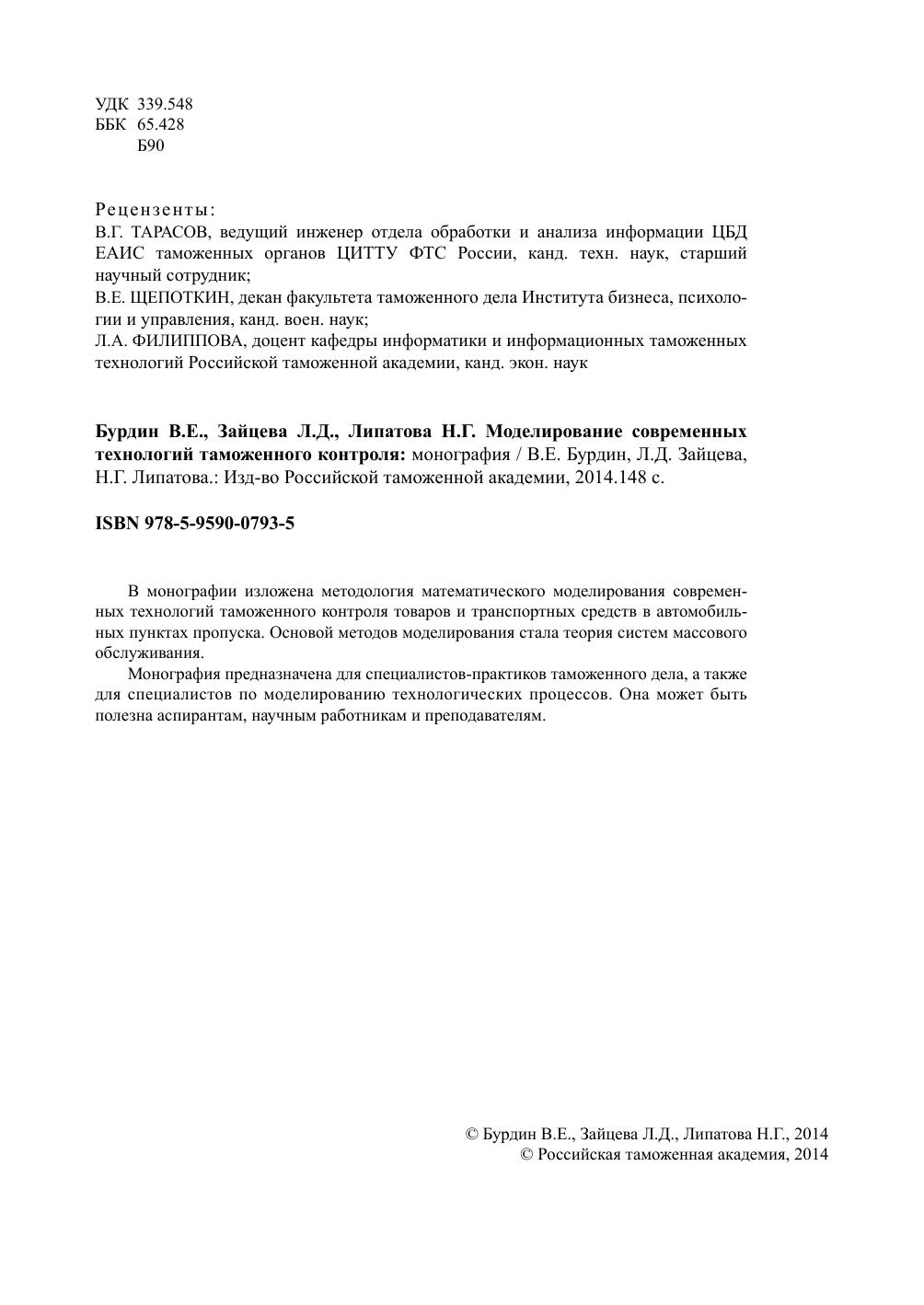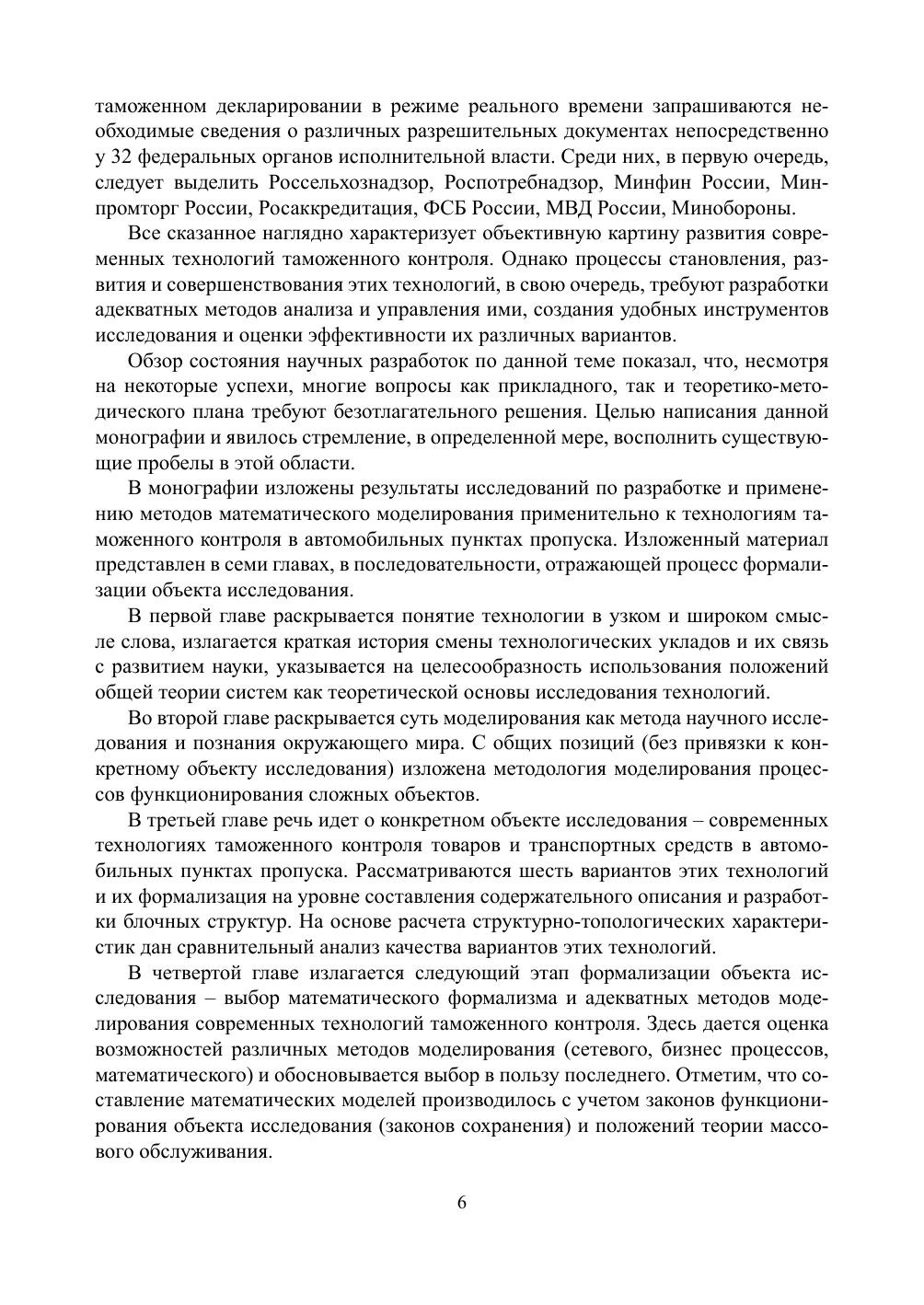 В монографии изложена методология математического моделирования современных технологий таможенного контроля товаров и транспортных средств в автомобильных пунктах пропуска. Основой методов моделирования стала теория систем массового обслуживания. Монография предназначена для специалистов-практиков таможенного дела, а также для специалистов по моделированию технологических процессов. Она может быть полезна аспирантам, научным работникам и преподавателям.