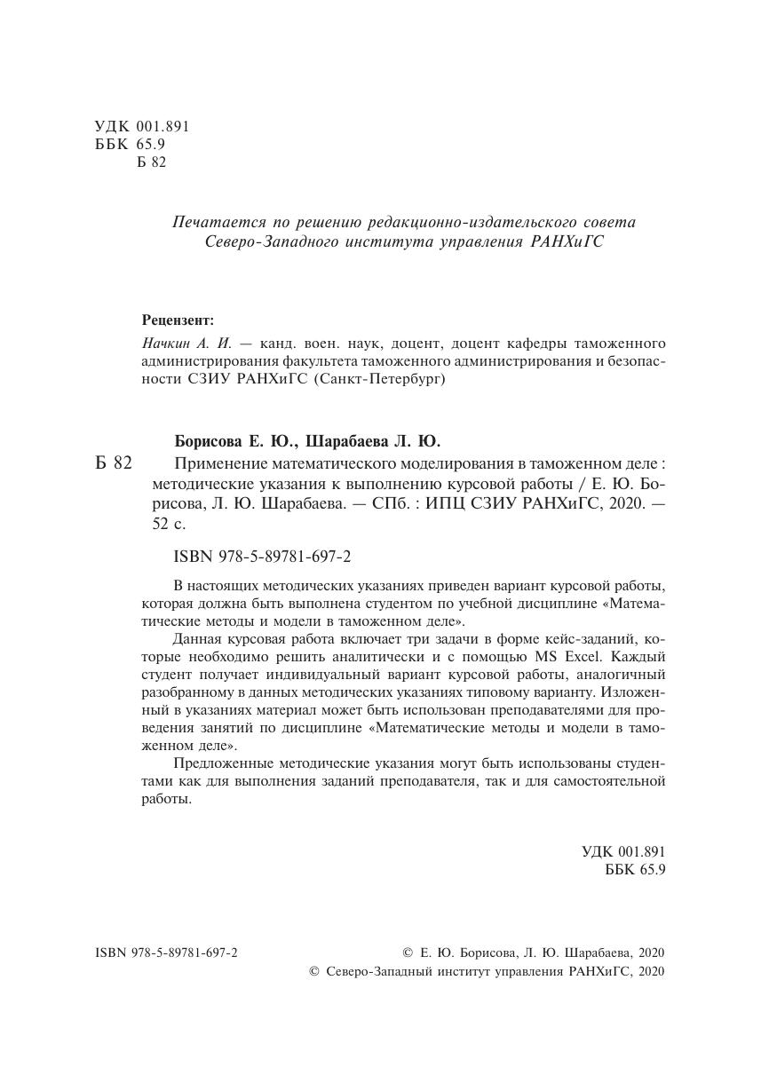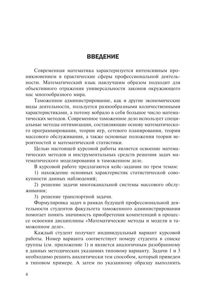 В настоящих методических указаниях приведен вариант курсовой работы, которая должна быть выполнена студентом по учебной дисциплине «Математические методы и модели в таможенном деле». Данная курсовая работа включает три задачи в форме кейс-заданий, которые необходимо решить аналитически и с помощью MS Excel. Каждый студент получает индивидуальный вариант курсовой работы, аналогичный разобранному в данных методических указаниях типовому варианту. Изложенный в указаниях материал может быть использован преподавателями для проведения занятий по дисциплине «Математические методы и модели в таможенном деле». Предложенные методические указания могут быть использованы студентами как для выполнения заданий преподавателя, так и для самостоятельной работы.