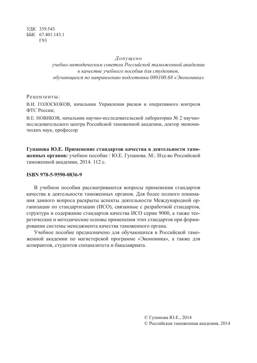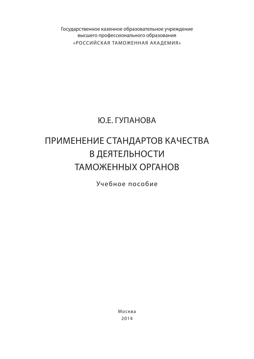 Применение стандартов качества в деятельности таможенных органов: учебное пособие