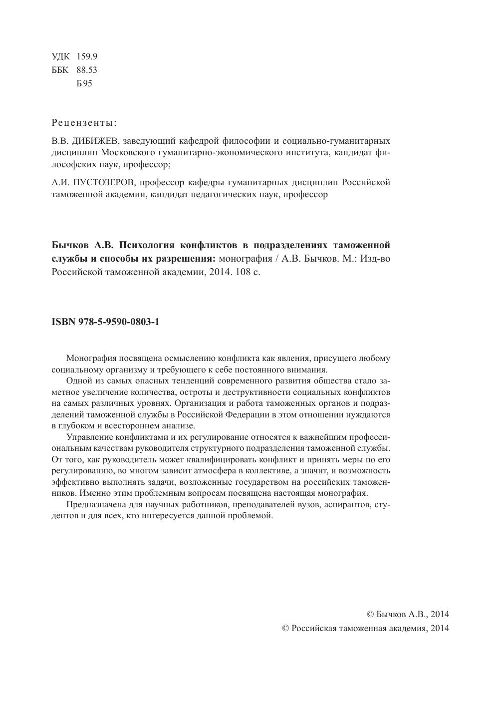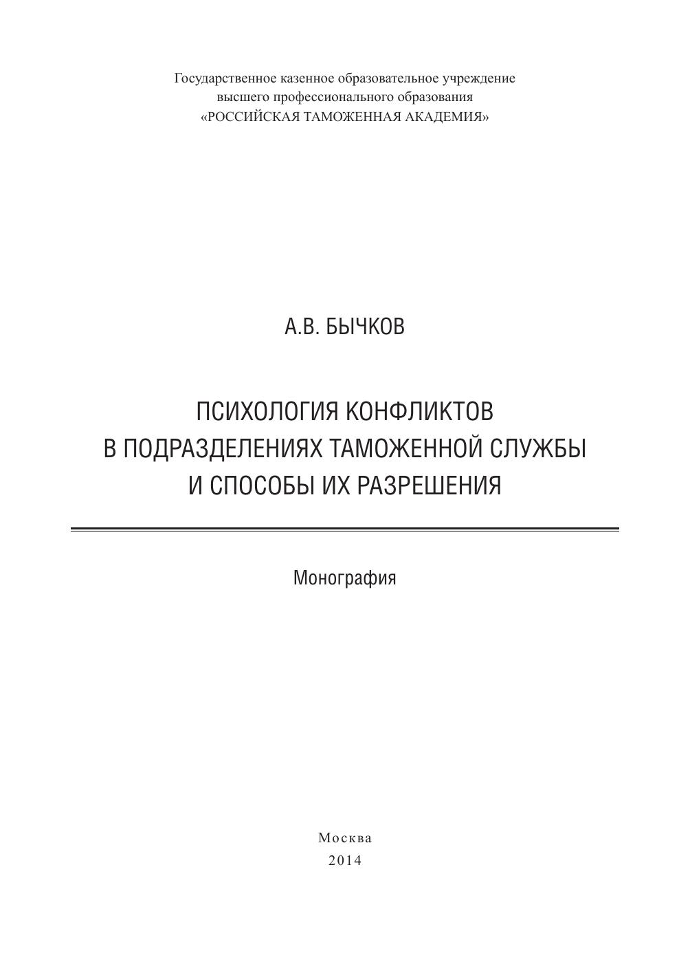 Монография посвящена осмыслению конфликта как явления, присущего любому социальному организму и требующего к себе постоянного внимания. Одной из самых опасных тенденций современного развития общества стало заметное увеличение количества, остроты и деструктивности социальных конфликтов на самых различных уровнях. Организация и работа таможенных органов и подразделений таможенной службы в Российской Федерации в этом отношении нуждаются в глубоком и всестороннем анализе. Управление конфликтами и их регулирование относятся к важнейшим професси ональным качествам руководителя структурного подразделения таможенной службы. От того, как руководитель может квалифицировать конфликт и принять меры по его регулированию, во многом зависит атмосфера в коллективе, а значит, и возможность эффективно выполнять задачи, возложенные государством на российских таможен ников. Именно этим проблемным вопросам посвящена настоящая монография.