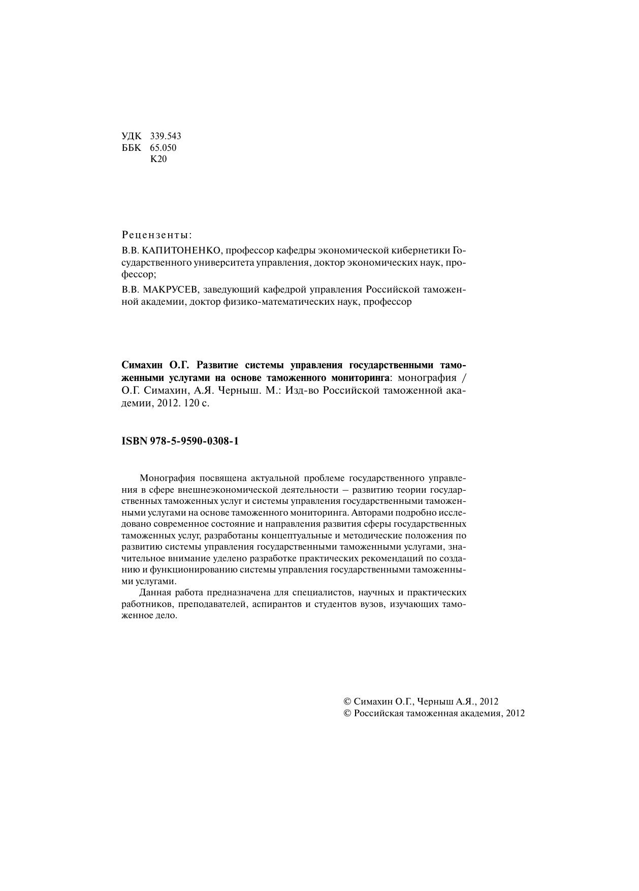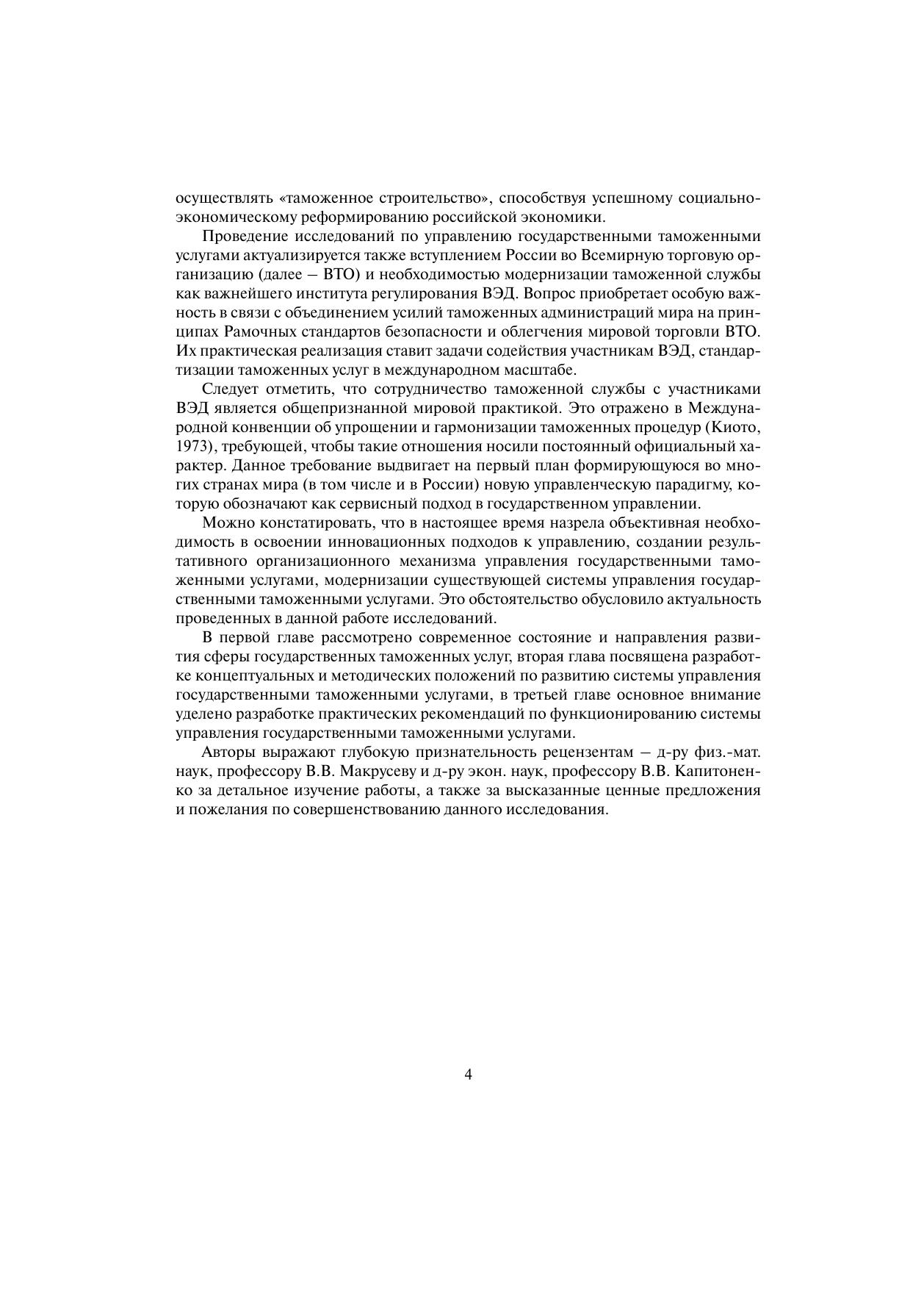 Монография посвящена актуальной проблеме государственного управления в сфере внешнеэкономической деятельности – развитию теории государственных таможенных услуг и системы управления государственными таможенными услугами на основе таможенного мониторинга. Авторами подробно исследовано современное состояние и направления развития сферы государственных таможенных услуг, разработаны концептуальные и методические положения по развитию системы управления государственными таможенными услугами, значительное внимание уделено разработке практических рекомендаций по созданию и функционированию системы управления государственными таможенными услугами. Данная работа предназначена для специалистов, научных и практических работников, преподавателей, аспирантов и студентов вузов, изучающих таможенное дело.