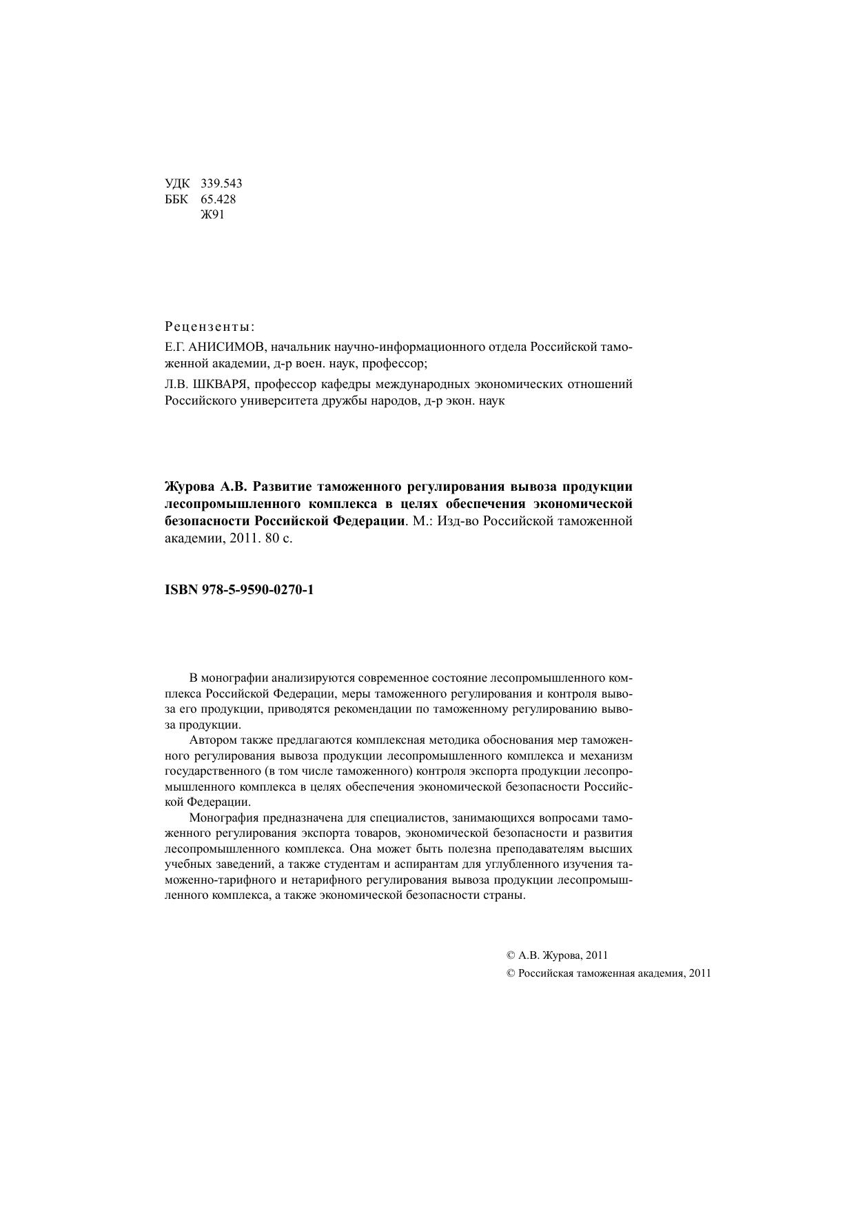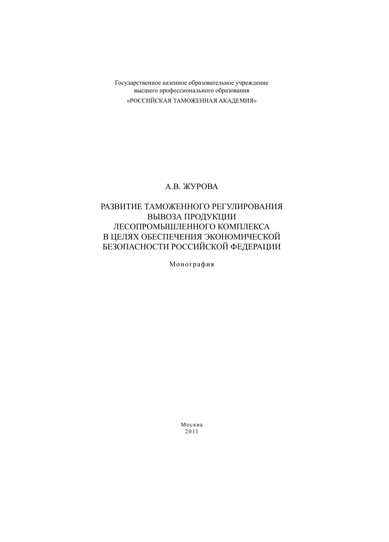монография предназначена для специалистов, занимающихся вопросами таможенного регулирования экспорта товаров, экономической безопасности и развития лесопромышленного комплекса. она может быть полезна преподавателям высших учебных заведений, а также студентам и аспирантам для углубленного изучения та моженно тарифного и нетарифного регулирования вывоза продукции лесопромыш ленного комплекса, а также экономической безопасности страны.