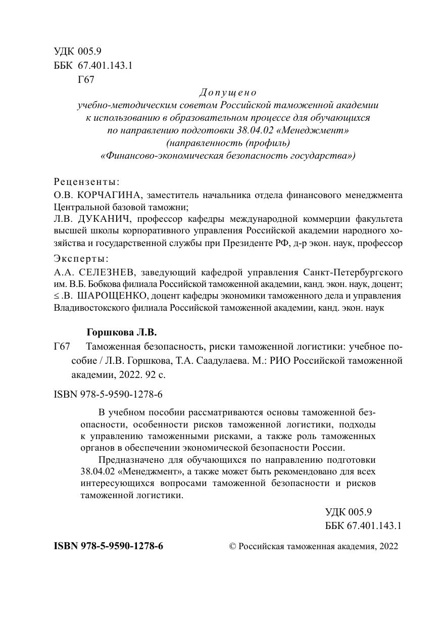В учебном пособии рассматриваются основы таможенной безопасности, особенности рисков таможенной логистики, подходы к управлению таможенными рисками, а также роль таможенных органов в обеспечении экономической безопасности России.