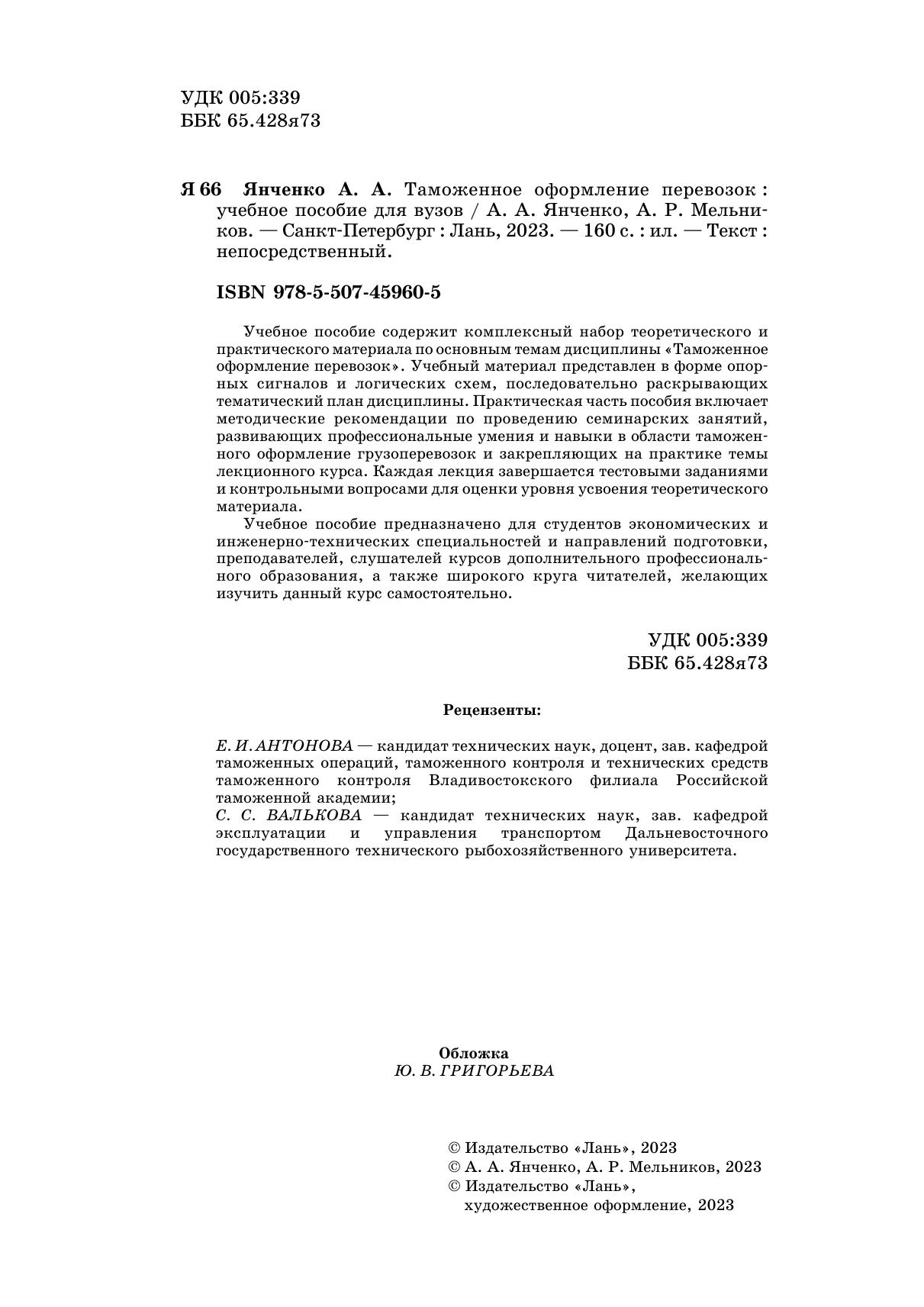 Учебное пособие содержит комплексный набор теоретического и практического материала по основным темам дисциплины «Таможенное оформление перевозок». Учебный материал представлен в форме опорных сигналов и логических схем, последовательно раскрывающих тематический план дисциплины. Практическая часть пособия включает методические рекомендации по проведению семинарских занятий, развивающих профессиональные умения и навыки в области таможенного оформление грузоперевозок и закрепляющих на практике темы лекционного курса. Каждая лекция завершается тестовыми заданиями и контрольными вопросами для оценки уровня усвоения теоретического материала. Учебное пособие предназначено для студентов экономических и инженерно-технических специальностей и направлений подготовки, преподавателей, слушателей курсов дополнительного профессионального образования, а также широкого круга читателей, желающих изучить данный курс самостоятельно.