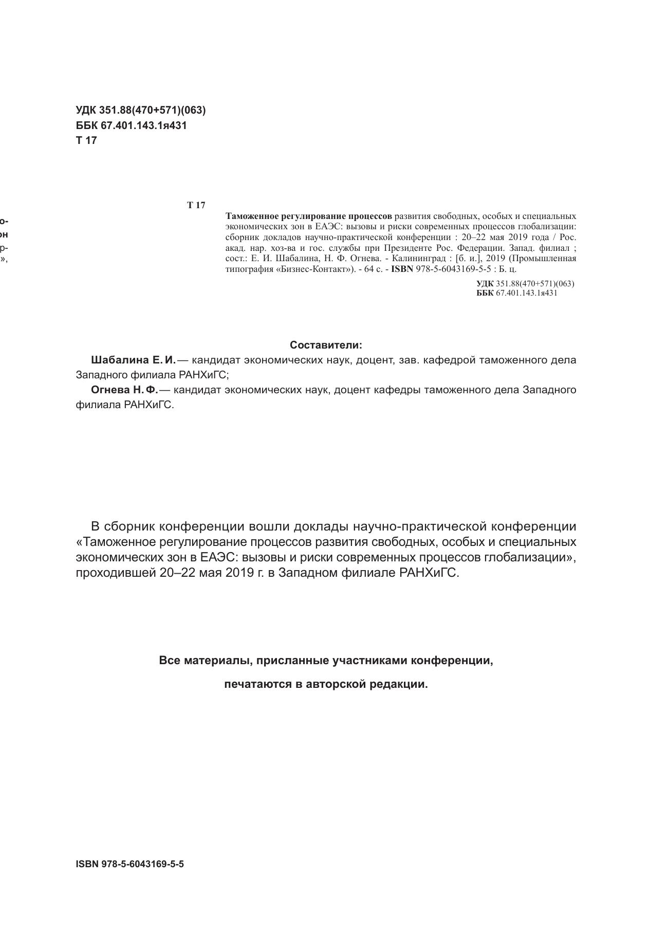 Таможенное регулирование процессов развития свободных, особых и специальных экономических зон в ЕАЭС: вызовы и риски современных процессов глобализации: сборник докладов научно-практической конференции: 20–22 мая 2019 года