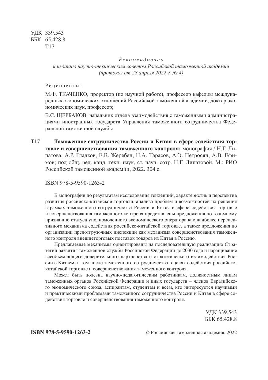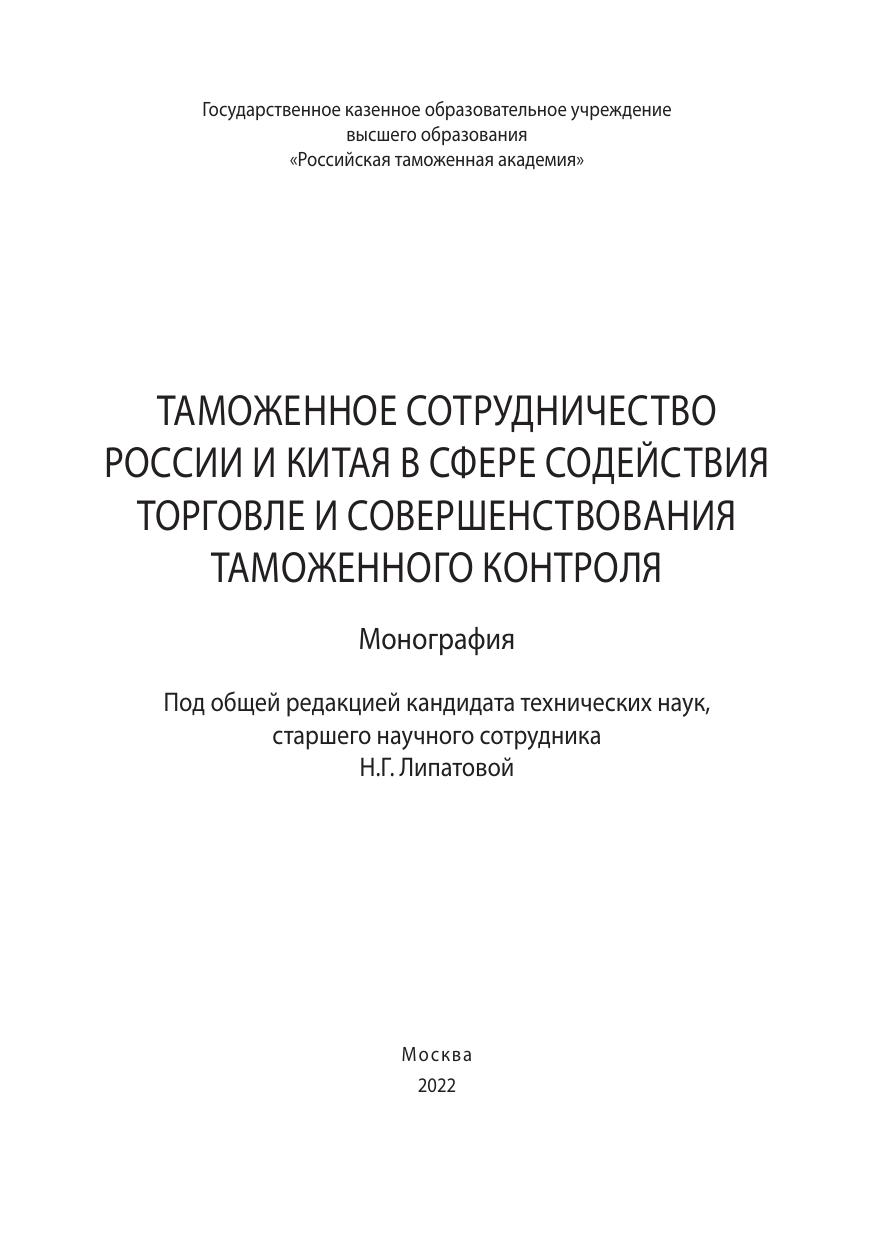 го экономического союза, аспирантам, студентам и всем, кто интересуется научными и практическими проблемами таможенного сотрудничества России и Китая в сфере содействия торговле и совершенствования таможенного контроля.