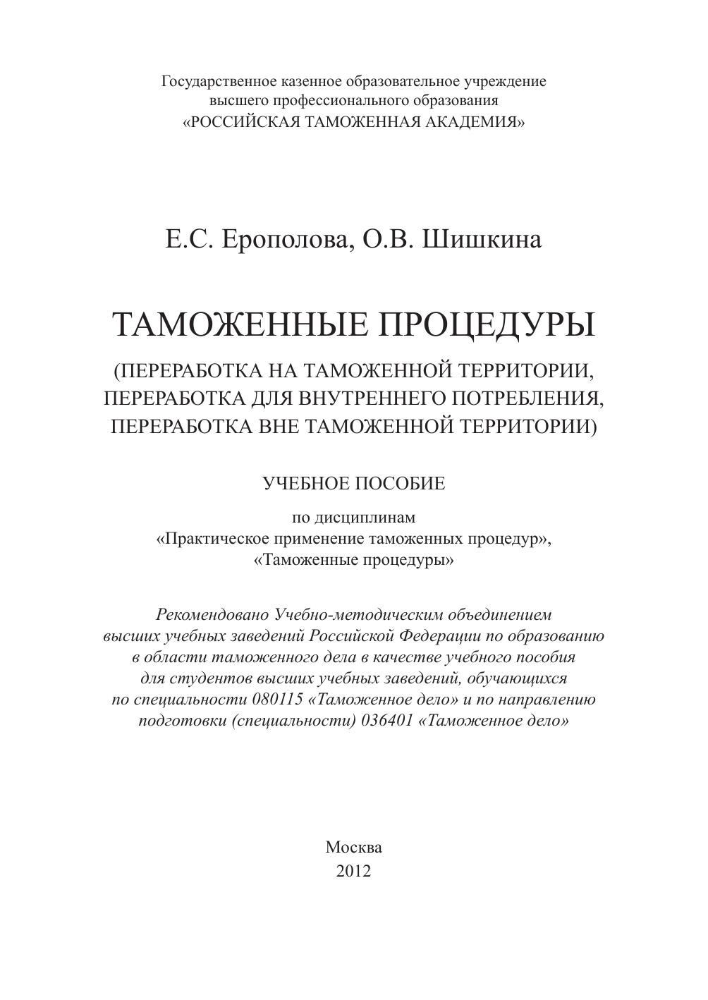 Таможенные процедуры (переработка на таможенной территории, переработка для внутреннего потребления, переработка вне таможенной территории): учебное пособие