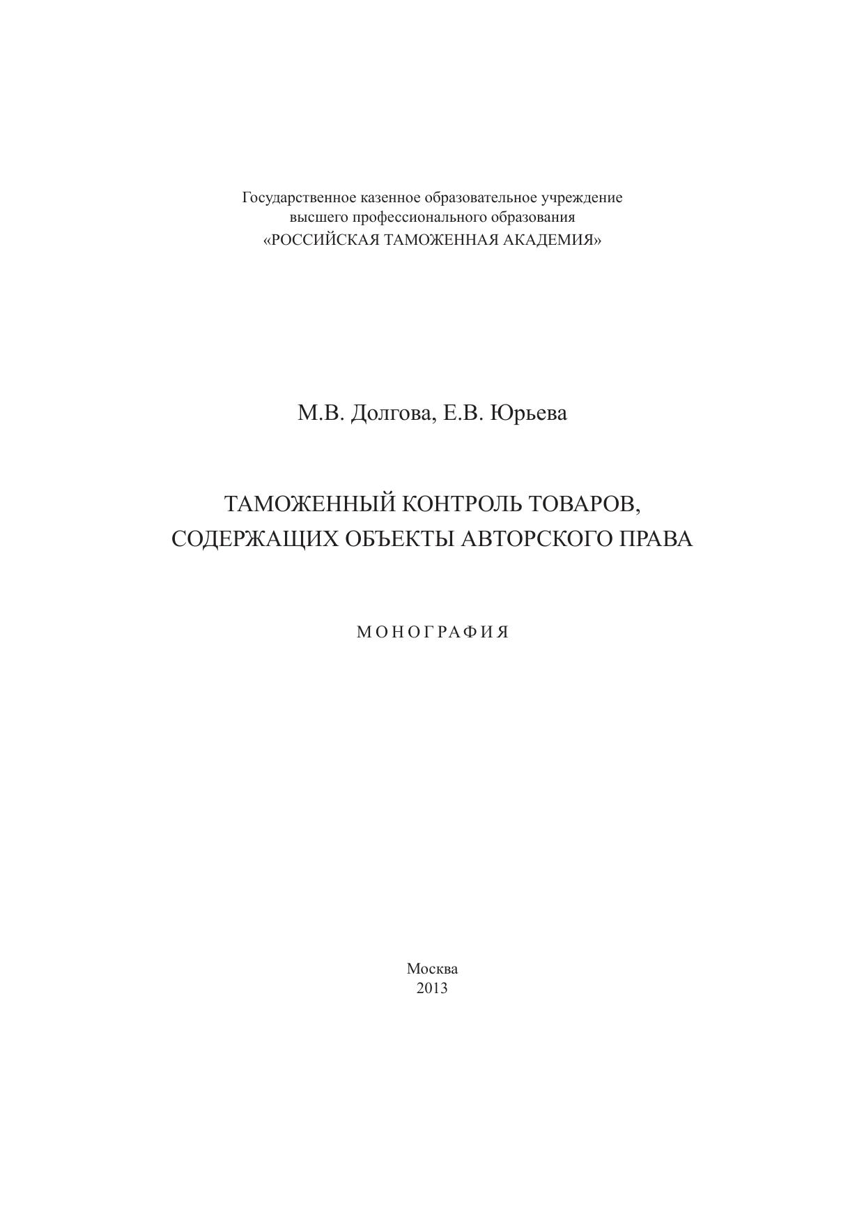 Таможенный контроль товаров, содержащих объекты авторского права: монография