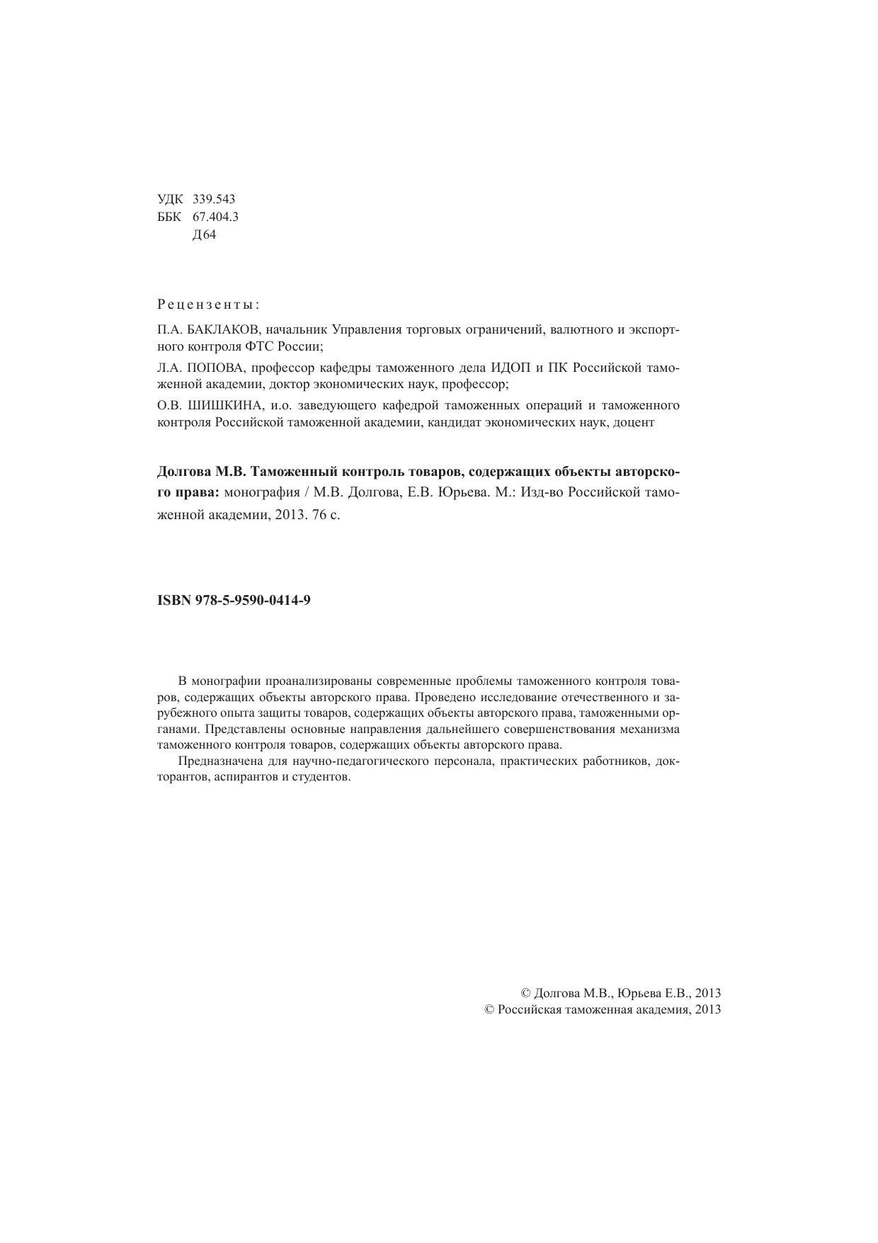 В монографии проанализированы современные проблемы таможенного контроля товаров, содержащих объекты авторского права. Проведено исследование отечественного и зарубежного опыта защиты товаров, содержащих объекты авторского права, таможенными органами. Представлены основные направления дальнейшего совершенствования механизма таможенного контроля товаров, содержащих объекты авторского права. Предназначена для научно-педагогического персонала, практических работников, докторантов, аспирантов и студентов.