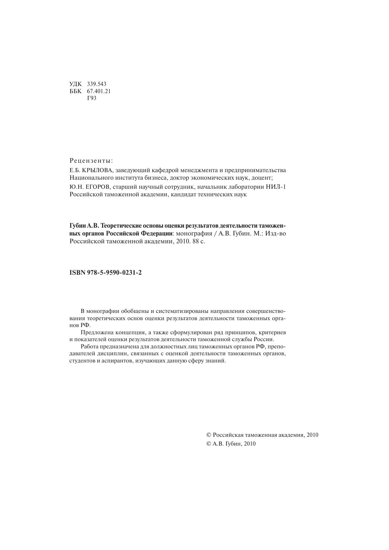 Теоретические основы оценки результатов деятельности таможенных органов РФ: монография