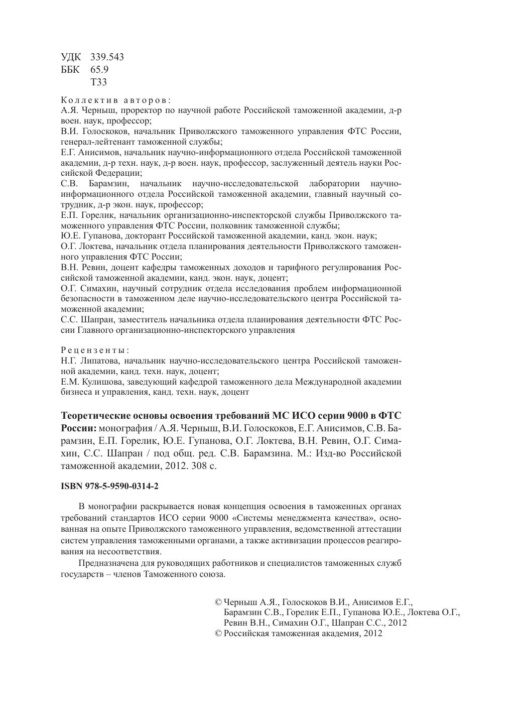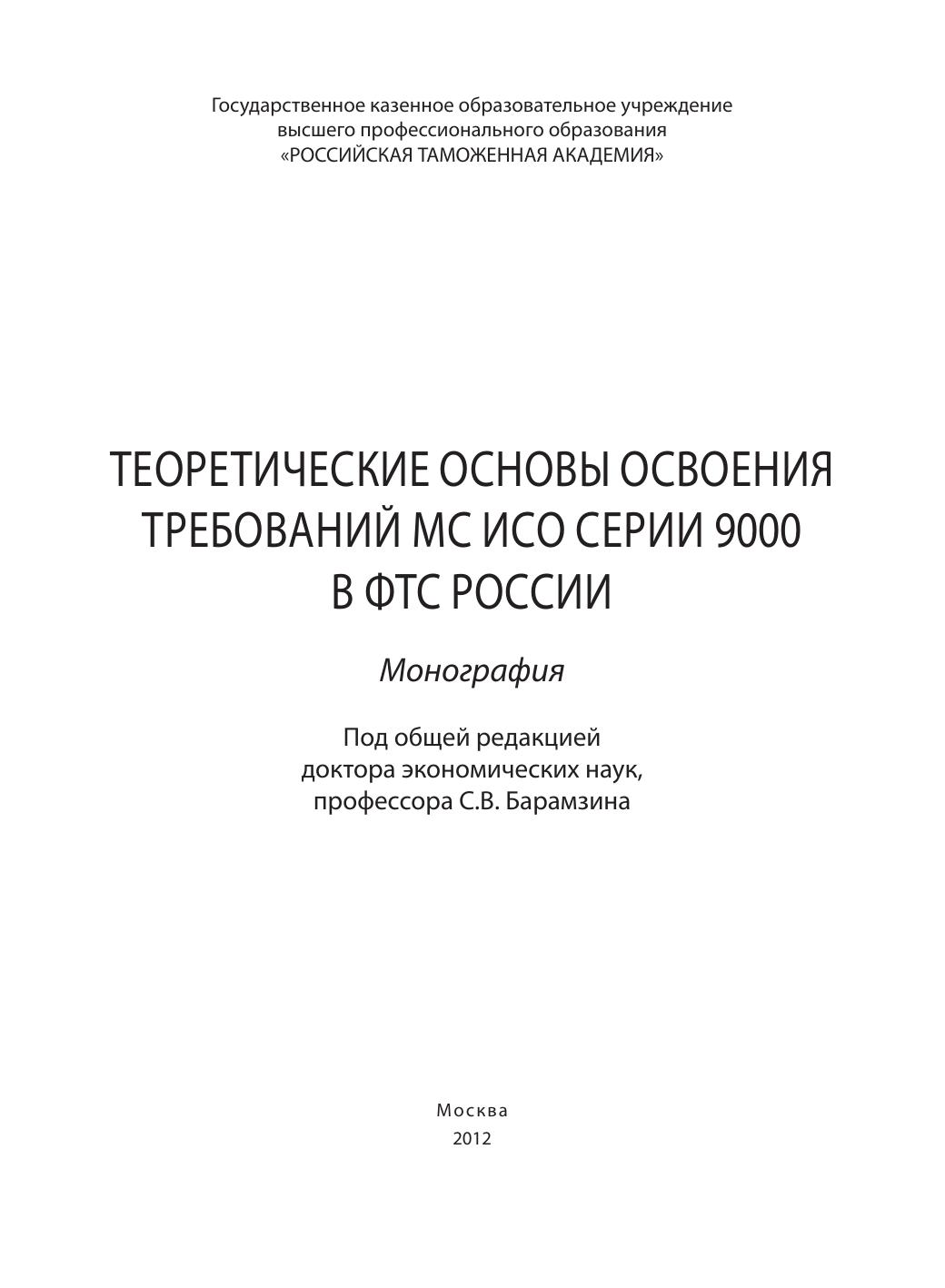 Теоретические основы освоения требований МС ИСО серии 9000 в ФТС России: монография