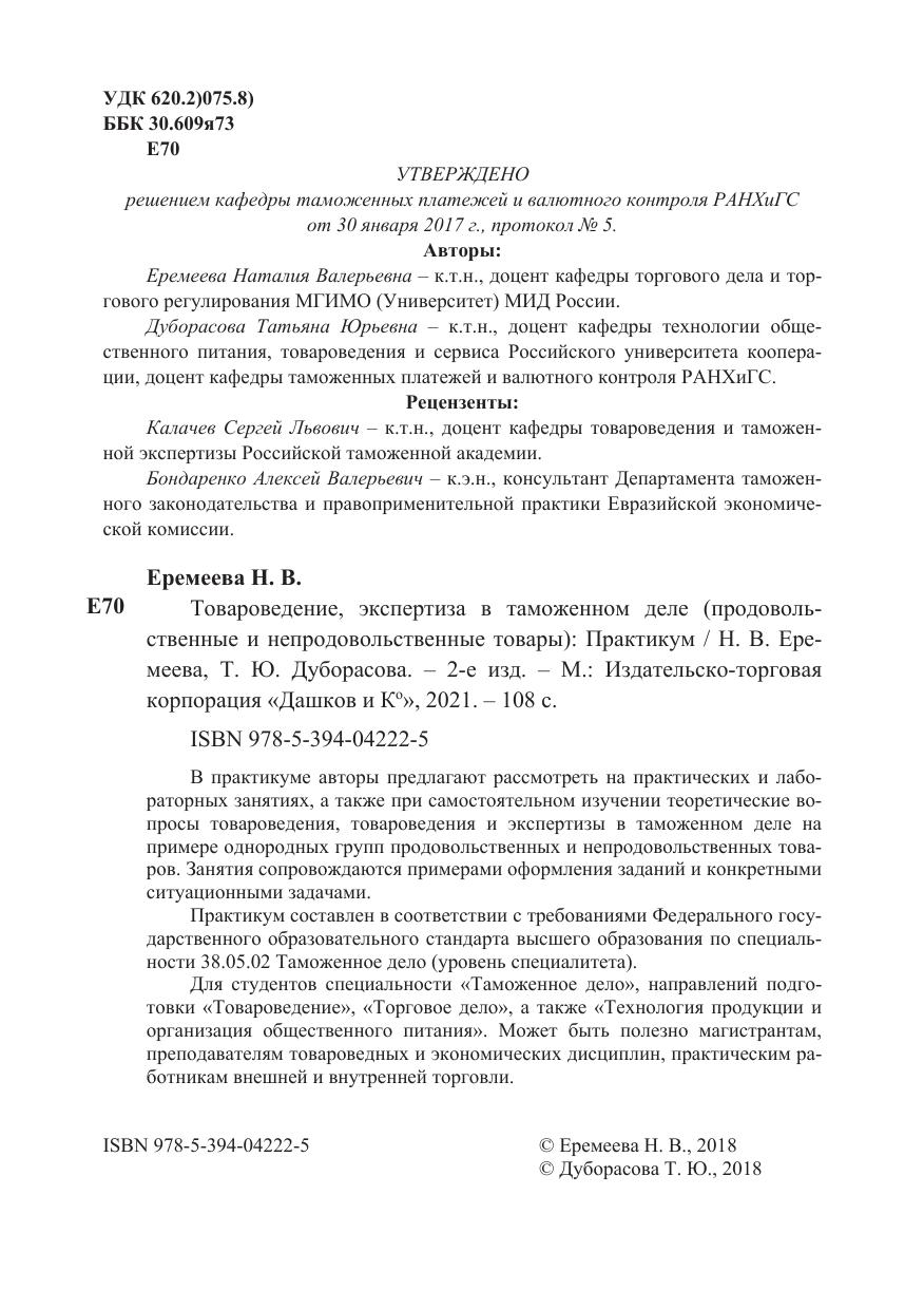 В практикуме авторы предлагают рассмотреть на практических и лабораторных занятиях, а также при самостоятельном изучении теоретические вопросы товароведения, товароведения и экспертизы в таможенном деле на примере однородных групп продовольственных и непродовольственных товаров. Занятия сопровождаются примерами оформления заданий и конкретными ситуационными задачами. Практикум составлен в соответствии с требованиями Федерального государственного образовательного стандарта высшего образования по специальности 38.05.02 Таможенное дело (уровень специалитета). Для студентов специальности «Таможенное дело», направлений подготовки «Товароведение», «Торговое дело», а также «Технология продукции и организация общественного питания». Может быть полезно магистрантам, преподавателям товароведных и экономических дисциплин, практическим работникам внешней и внутренней торговли.