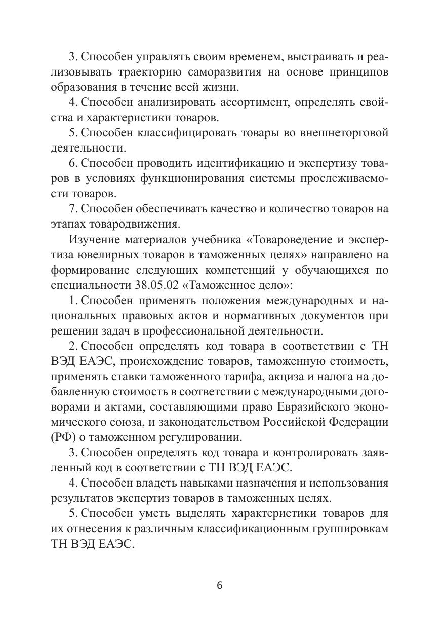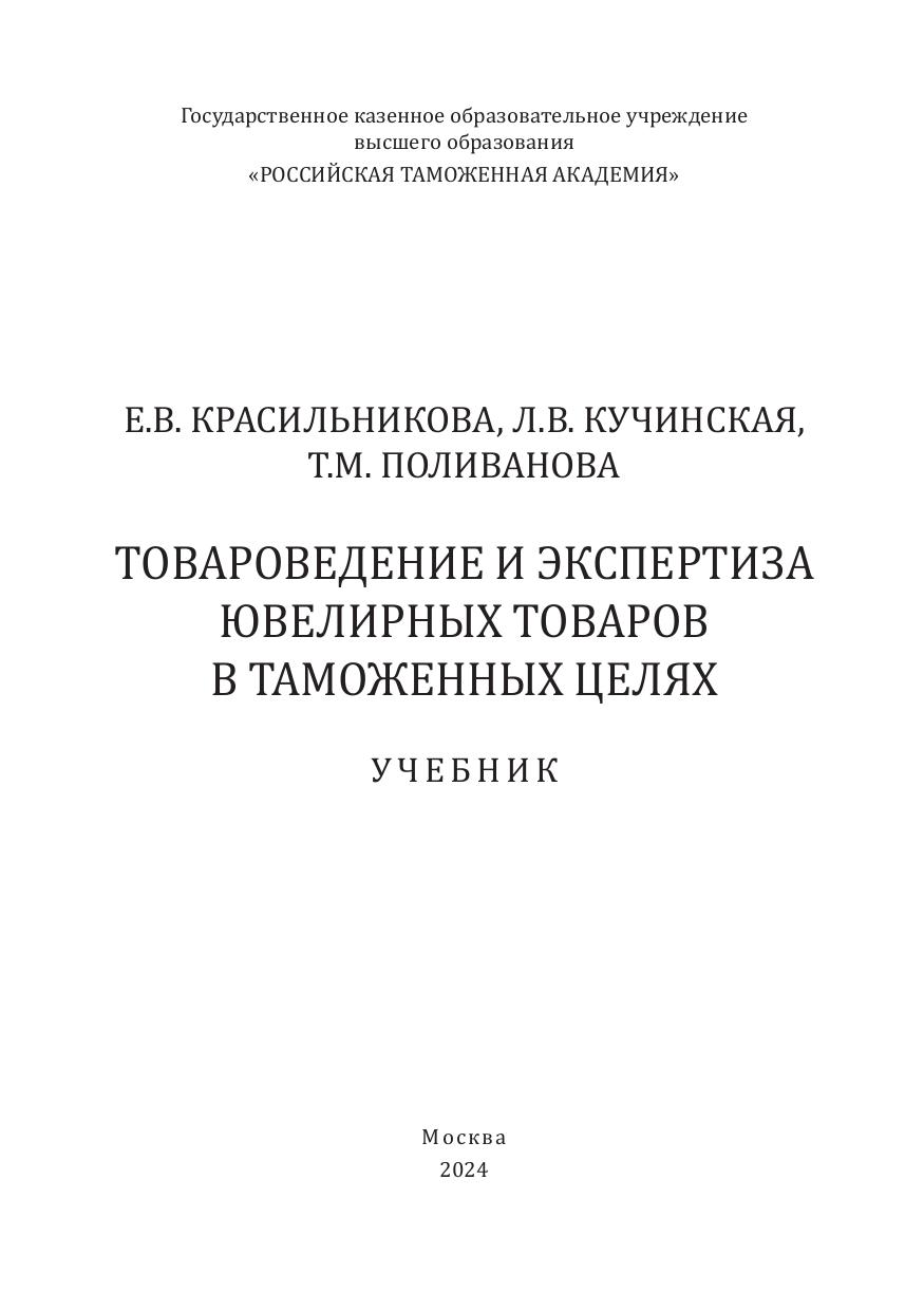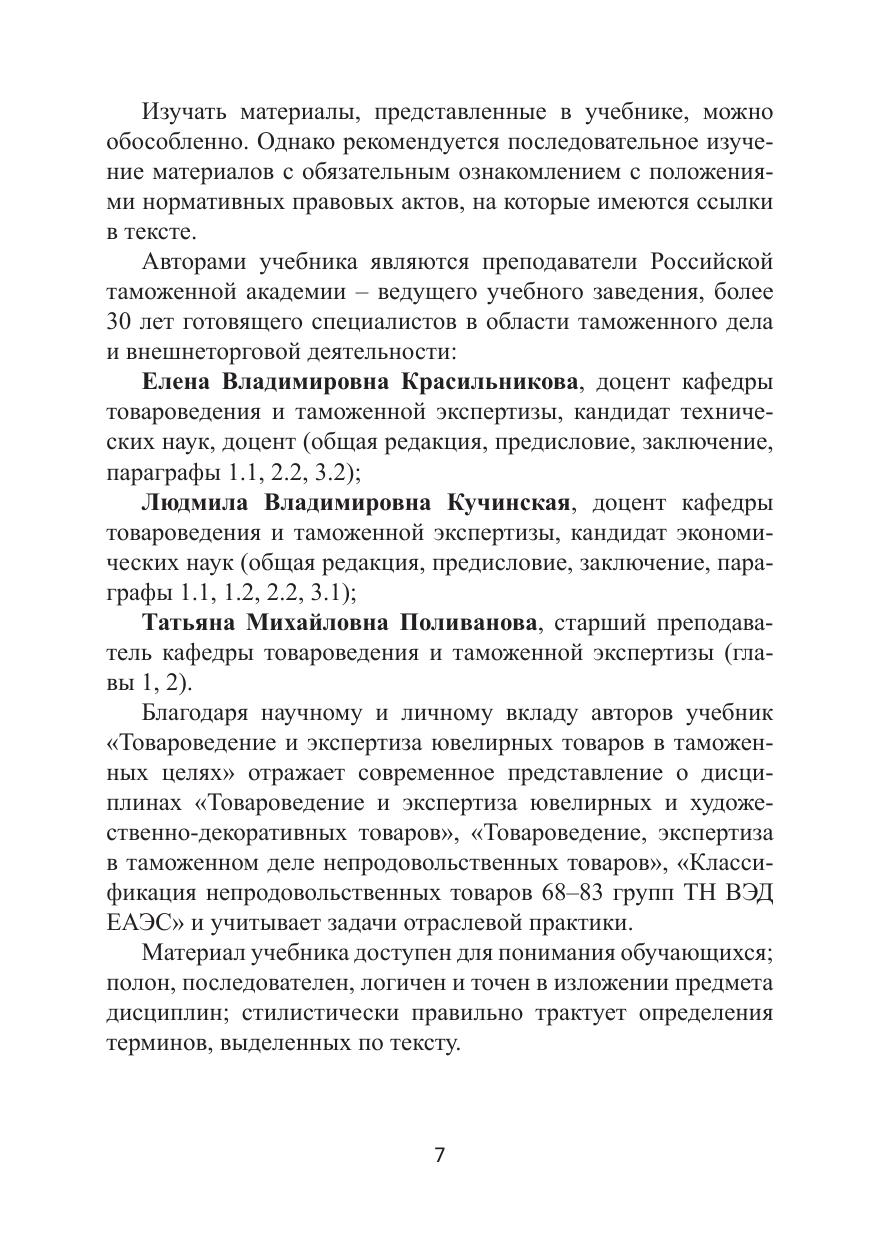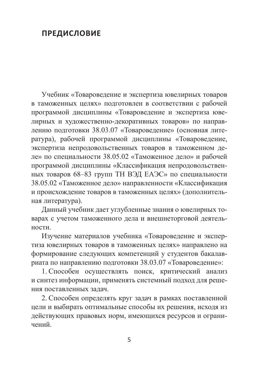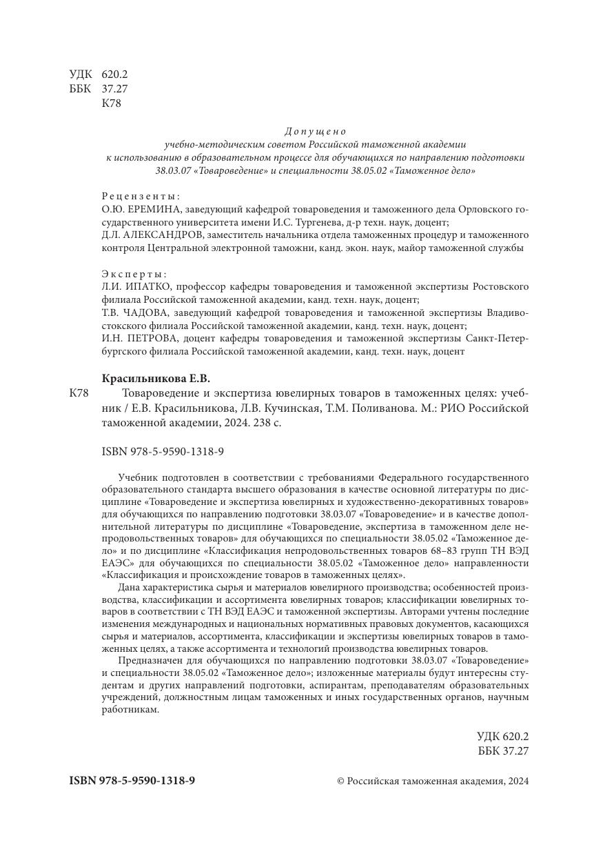 Учебник подготовлен в соответствии с требованиями Федерального государственного образовательного стандарта высшего образования в качестве основной литературы по дисциплине «Товароведение и экспертиза ювелирных и художественно-декоративных товаров» для обучающихся по направлению подготовки 38.03.07 «Товароведение» и в качестве дополнительной литературы по дисциплине «Товароведение, экспертиза в таможенном деле непродовольственных товаров» для обучающихся по специальности 38.05.02 «Таможенное дело» и по дисциплине «Классификация непродовольственных товаров 68–83 групп ТН ВЭД ЕАЭС» для обучающихся по специальности 38.05.02 «Таможенное дело» направленности «Классификация и происхождение товаров в таможенных целях». Дана характеристика сырья и материалов ювелирного производства; особенностей производства, классификации и ассортимента ювелирных товаров; классификации ювелирных товаров в соответствии с ТН ВЭД ЕАЭС и таможенной экспертизы. Авторами учтены последние изменения международных и национальных нормативных правовых документов, касающихся сырья и материалов, ассортимента, классификации и экспертизы ювелирных товаров в таможенных целях, а также ассортимента и технологий производства ювелирных товаров.