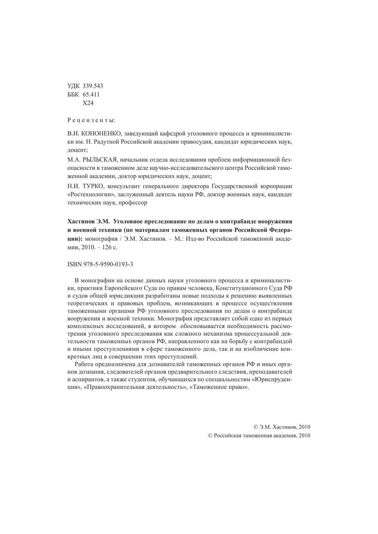 Уголовное преследование по делам о контрабанде вооружения и военной техники по материалам таможенных органов РФ: монография