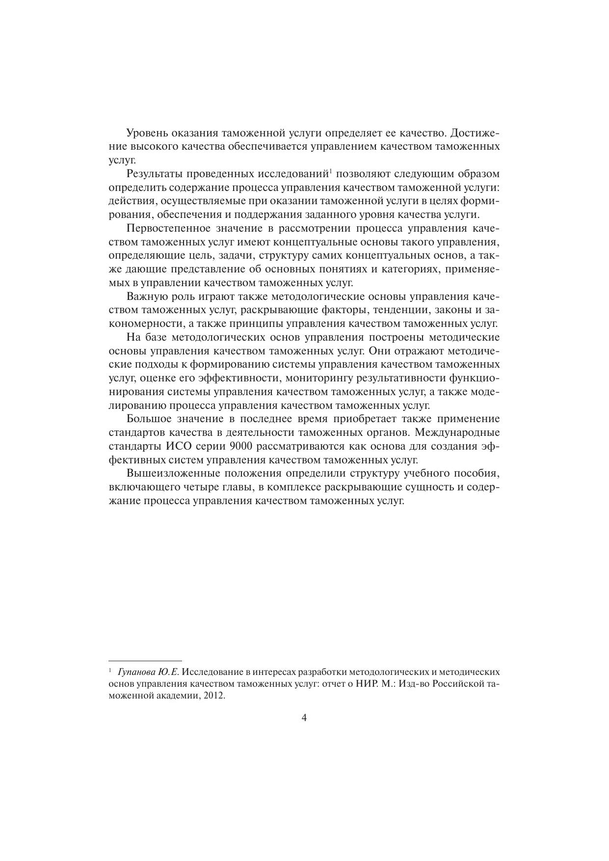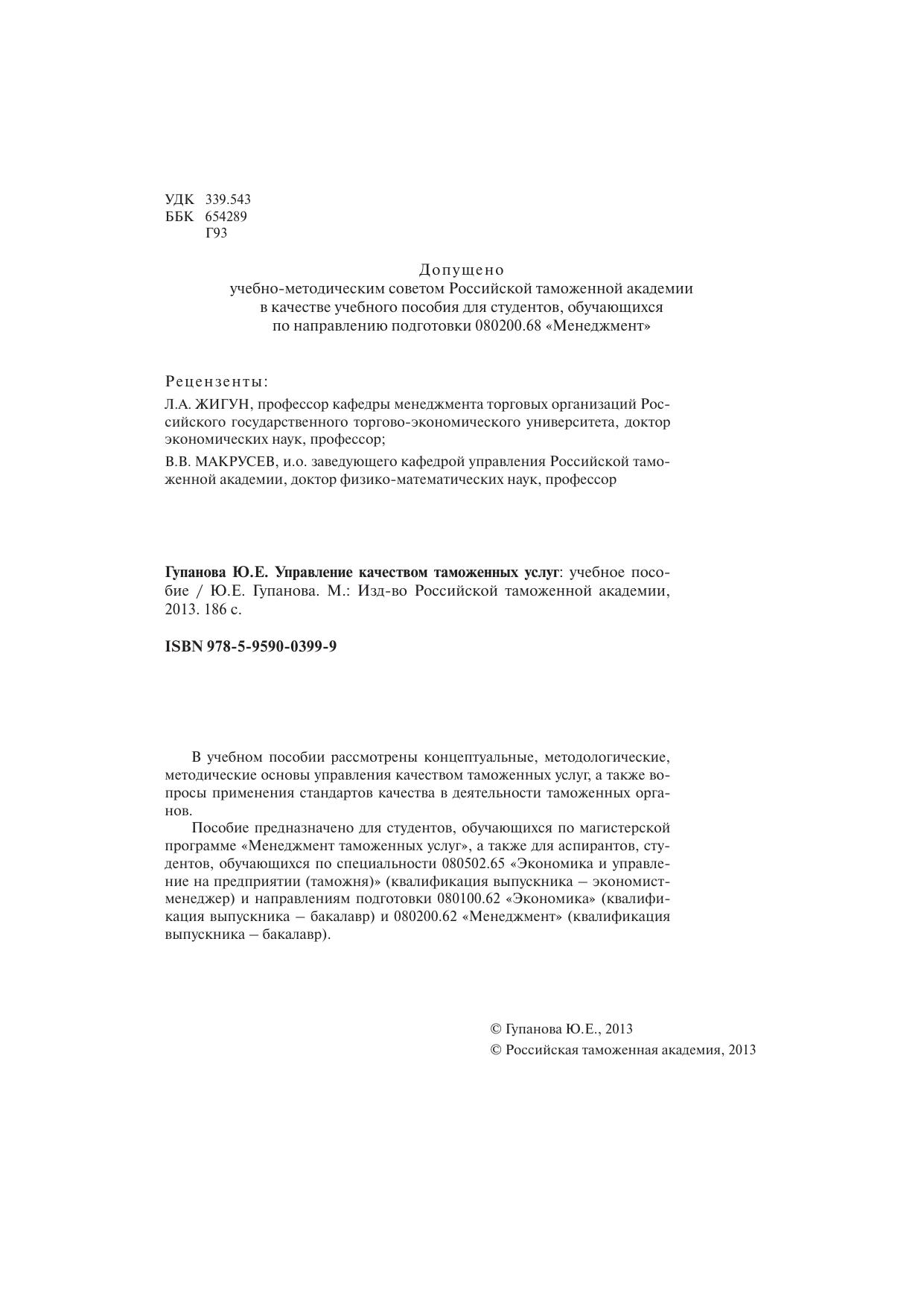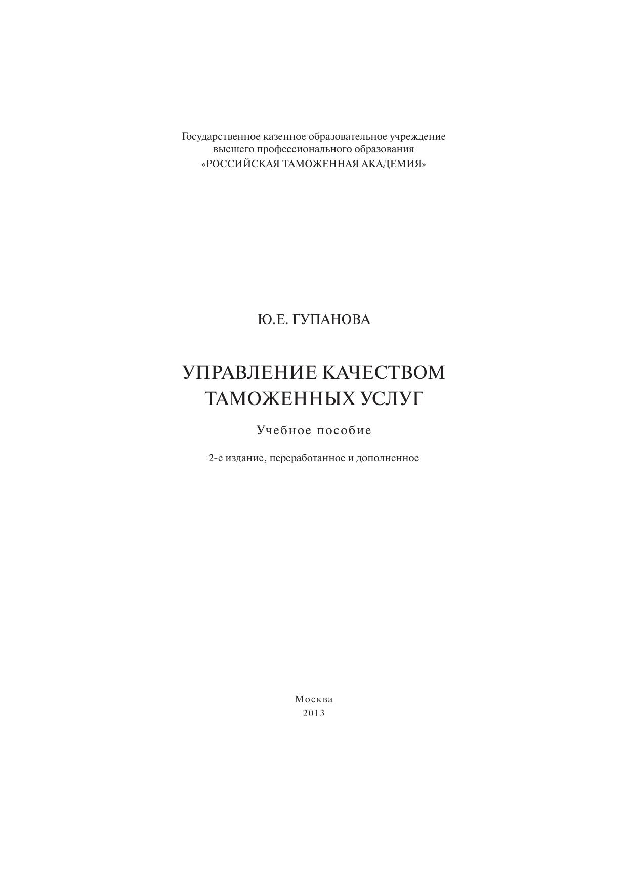 В учебном пособии рассмотрены концептуальные, методологические, методические основы управления качеством таможенных услуг, а также вопросы применения стандартов качества в деятельности таможенных органов. Пособие предназначено для студентов, обучающихся по магистерской программе «Менеджмент таможенных услуг», а также для аспирантов, студентов, обучающихся по специальности 080502.65 «Экономика и управление на предприятии (таможня)» (квалификация выпускника — экономист-менеджер) и направлениям подготовки 080100.62 «Экономика» (квалифи -кация выпускника — бакалавр) и 080200.62 «Менеджмент» (квалификация выпускника — бакалавр).