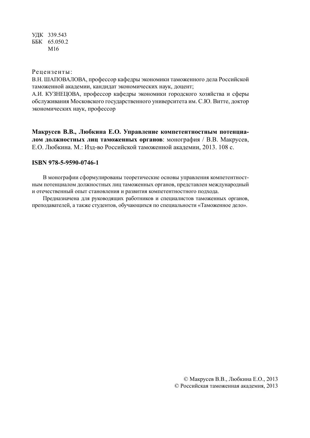 В монографии сформулированы теоретические основы управления компетентностным потенциалом должностных лиц таможенных органов, представлен международный и отечественный опыт становления и развития компетентностного подхода.