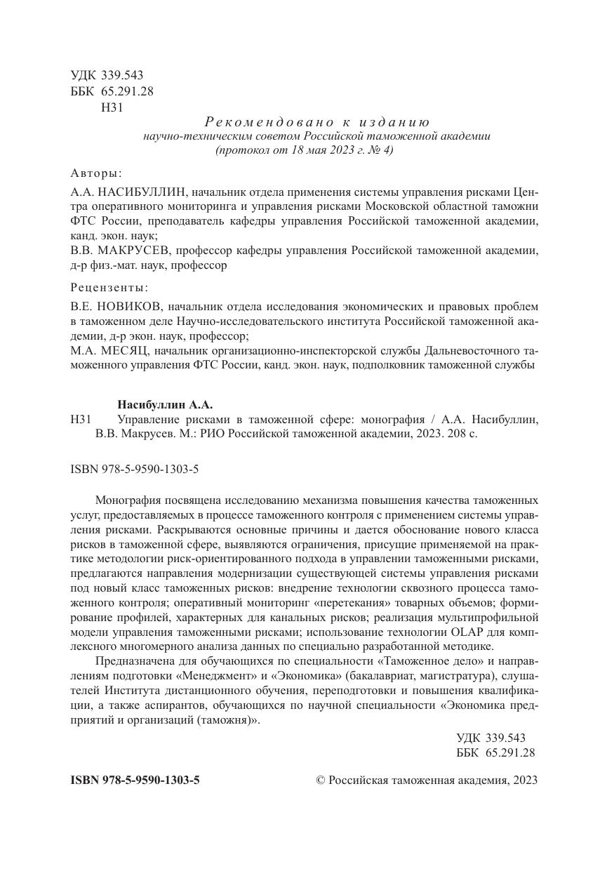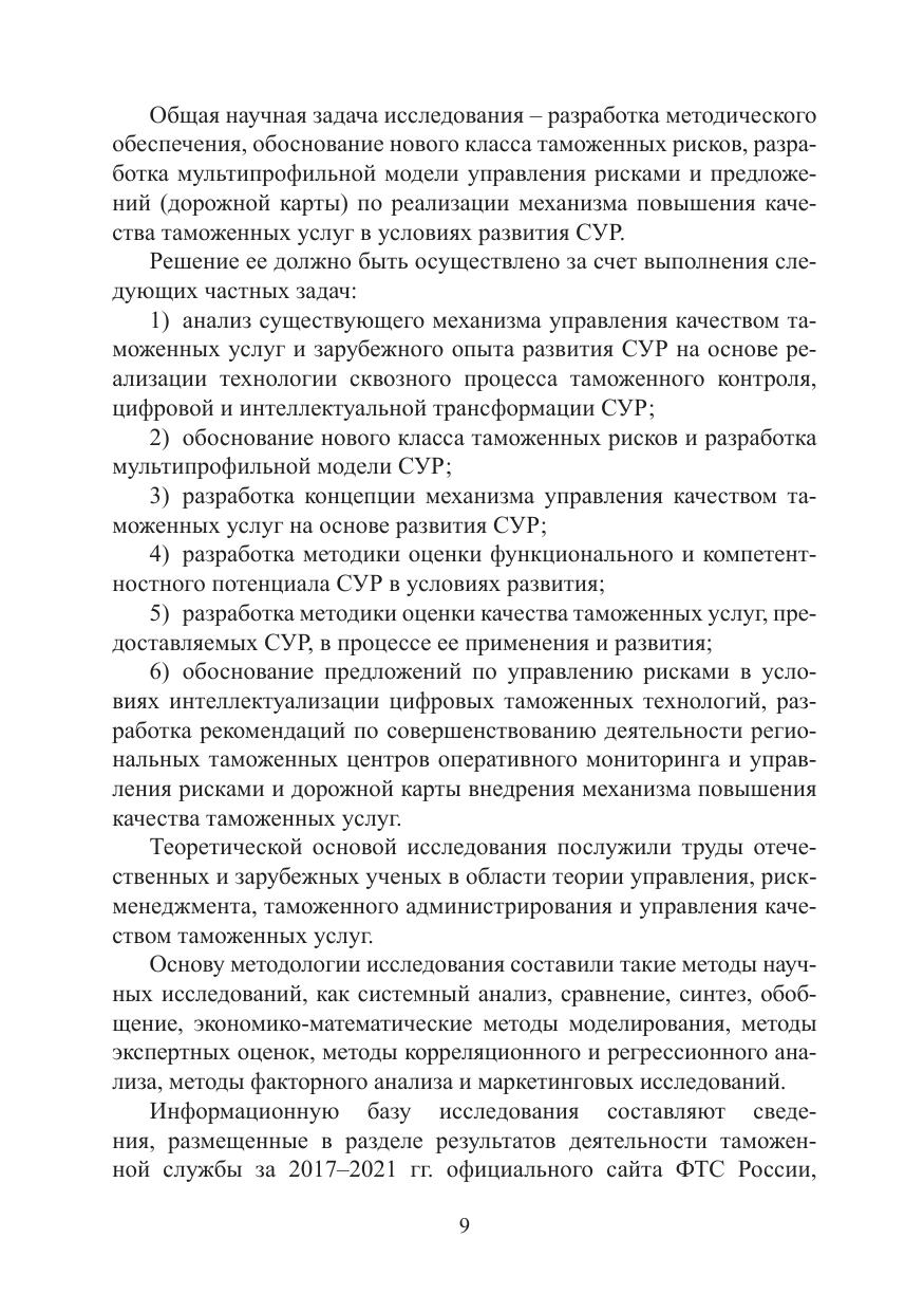 Монография посвящена исследованию механизма повышения качества таможенных услуг, предоставляемых в процессе таможенного контроля с применением системы управления рисками. Раскрываются основные причины и дается обоснование нового класса рисков в таможенной сфере, выявляются ограничения, присущие применяемой на практике методологии риск-ориентированного подхода в управлении таможенными рисками, предлагаются направления модернизации существующей системы управления рисками под новый класс таможенных рисков: внедрение технологии сквозного процесса таможенного контроля; оперативный мониторинг «перетекания» товарных объемов; формирование профилей, характерных для канальных рисков; реализация мультипрофильной