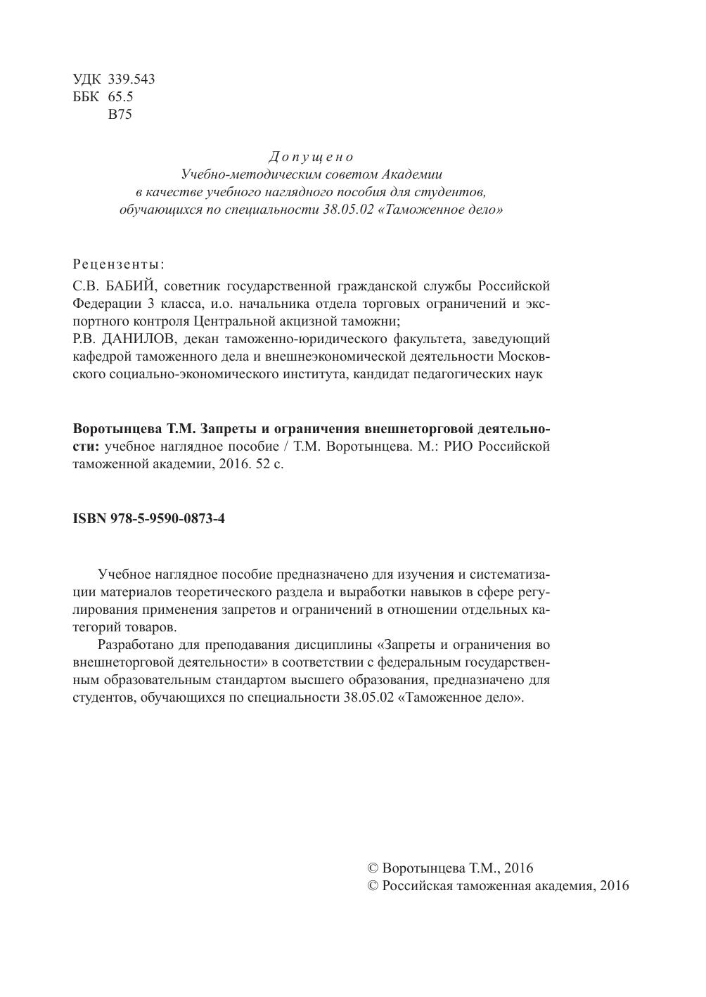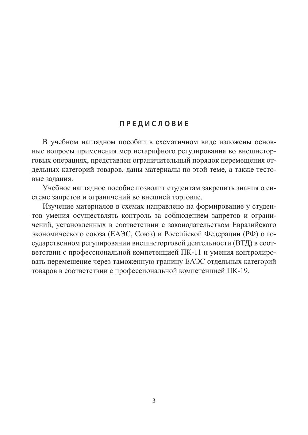 Учебное наглядное пособие предназначено для изучения и систематизации материалов теоретического раздела и выработки навыков в сфере регулирования применения запретов и ограничений в отношении отдельных категорий товаров. Разработано для преподавания дисциплины «Запреты и ограничения во внешнеторговой деятельности» в соответствии с федеральным государственным образовательным стандартом высшего образования, предназначено для студентов, обучающихся по специальности 38.05.02 «Таможенное дело».