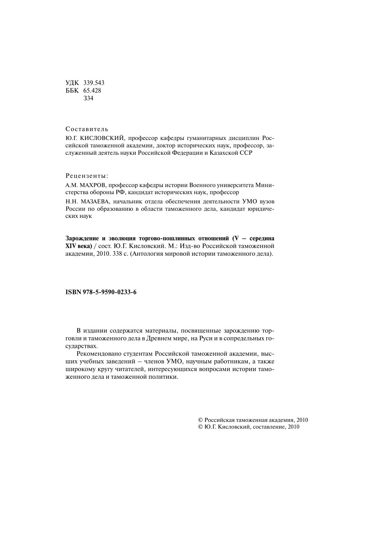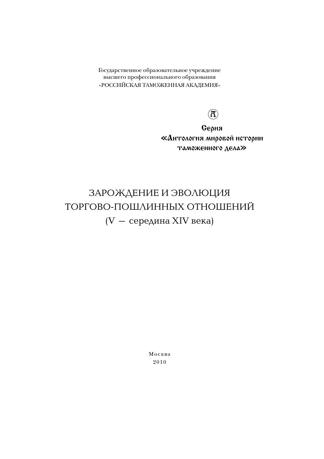 В издании содержатся материалы, посвященные зарождению торговли и таможенного дела в Древнем мире, на Руси и в сопредельных государствах. Рекомендовано студентам Российской таможенной академии, высших учебных заведений — членов УМО, научным работникам, а также широкому кругу читателей, интересующихся вопросами истории таможенного дела и таможенной политики.