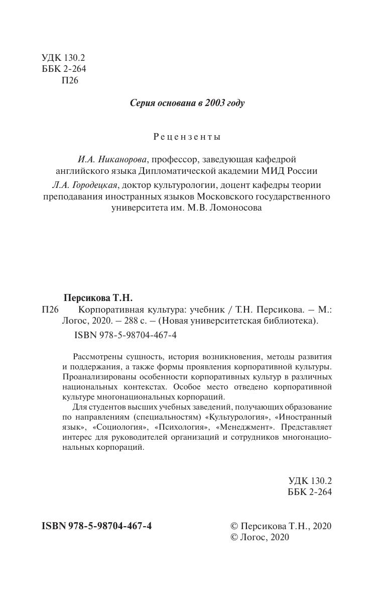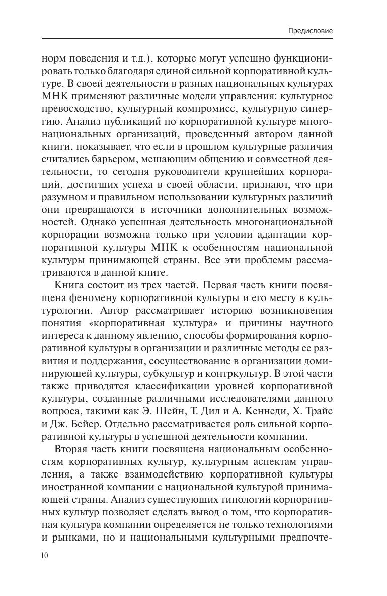 Рассмотрены сущность, история возникновения, методы развития и поддержания, а также формы проявления корпоративной культуры. Проанализированы особенности корпоративных культур в различных национальных контекстах. Особое место отведено корпоративной культуре многонациональных корпораций. Для студентов высших учебных заведений, получающих образование по направлениям (специальностям) «Культурология», «Иностранный язык», «Социология», «Психология», «Менеджмент». Представляет интерес для руководителей организаций и сотрудников многонациональных корпораций.