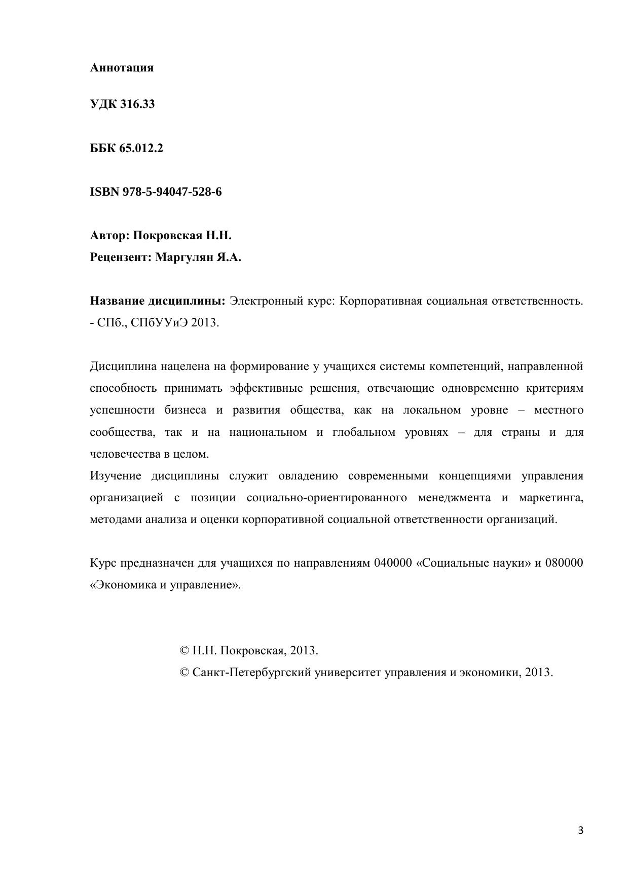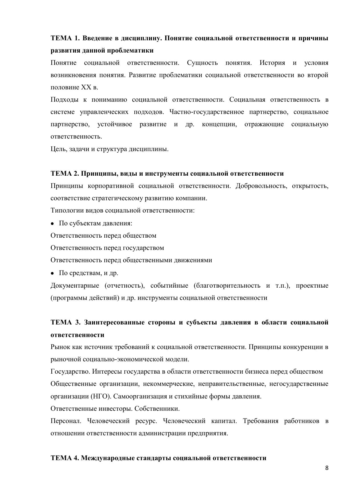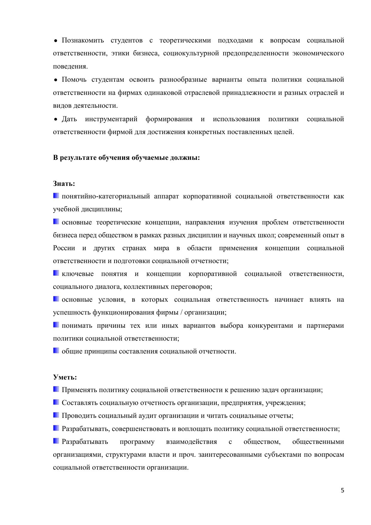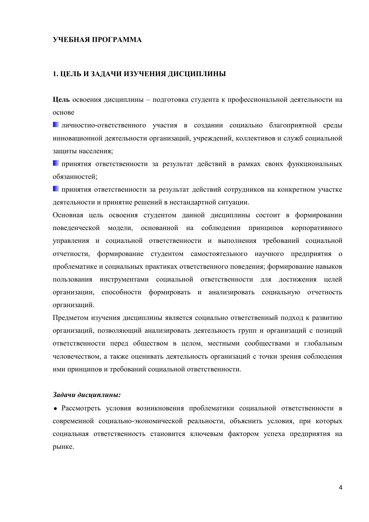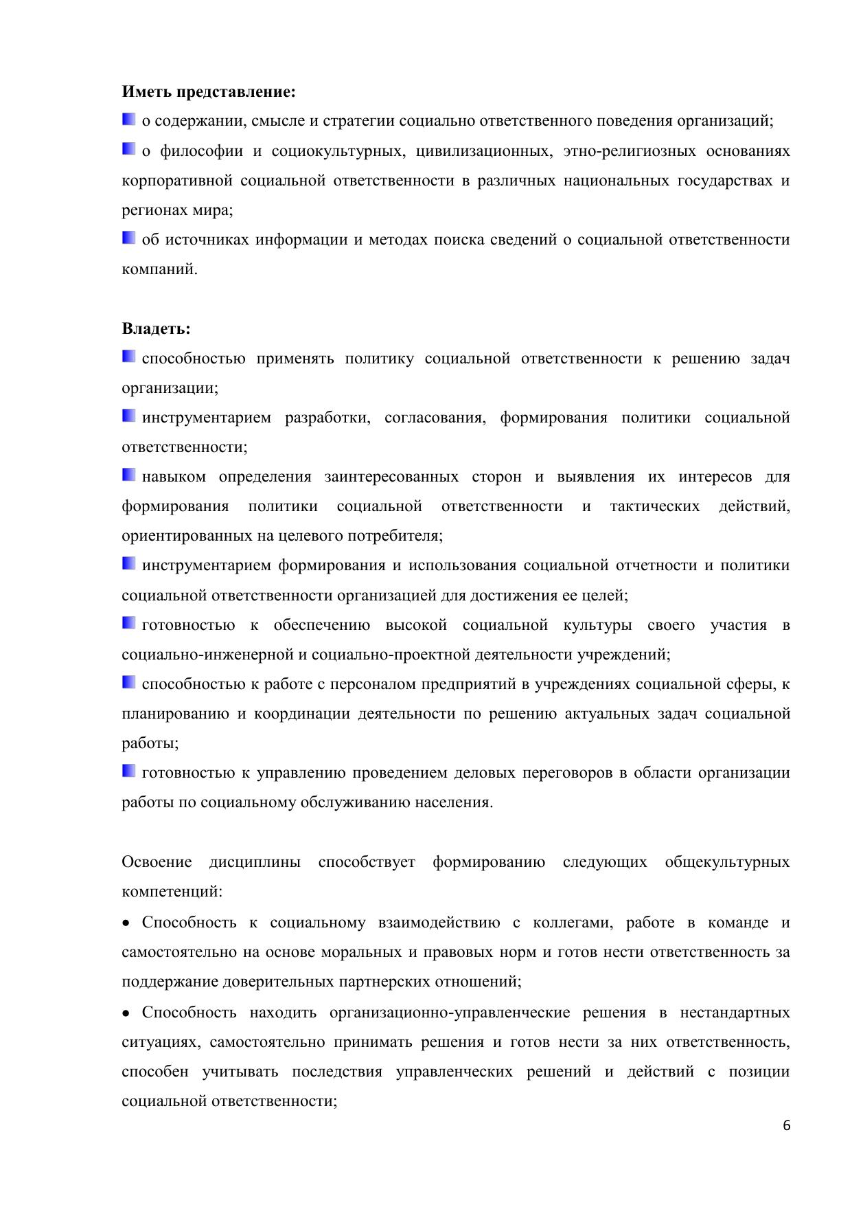 Дисциплина нацелена на формирование у учащихся системы компетенций, направленной способность принимать эффективные решения, отвечающие одновременно критериям успешности бизнеса и развития общества, как на локальном уровне – местного сообщества, так и на национальном и глобальном уровнях – для страны и для человечества в целом. Изучение дисциплины служит овладению современными концепциями управления организацией с позиции социально-ориентированного менеджмента и маркетинга, методами анализа и оценки корпоративной социальной ответственности организаций. Курс предназначен для учащихся по направлениям 040000 «Социальные науки» и 080000 «Экономика и управление».