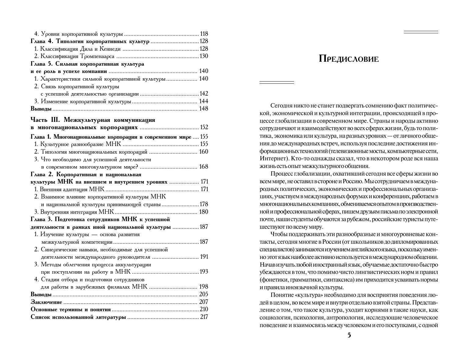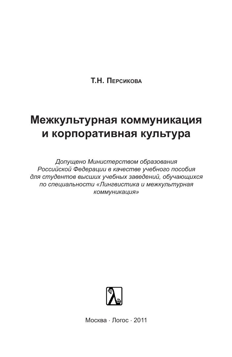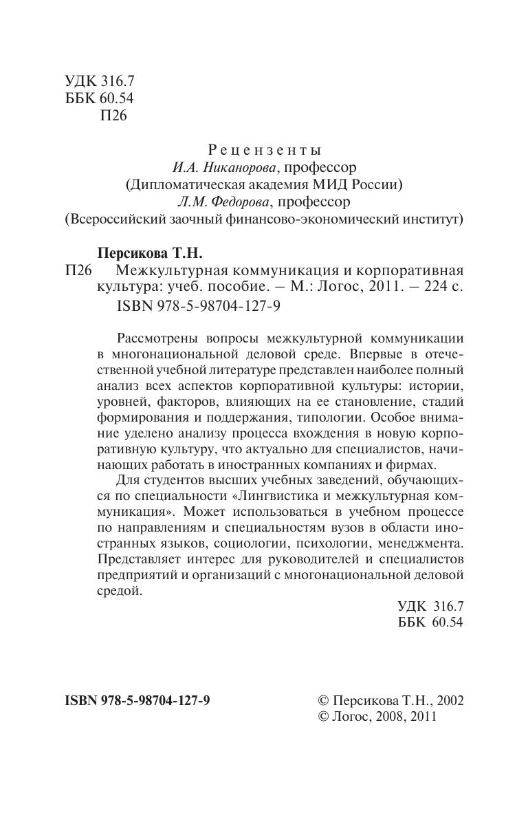 Рассмотрены вопросы межкультурной коммуникации в многонациональной деловой среде. Впервые в отечественной учебной литературе представлен наиболее полный анализ всех аспектов корпоративной культуры: истории, уровней, факторов, влияющих на ее становление, стадий формирования и поддержания, типологии. Особое внимание уделено анализу процесса вхождения в новую корпоративную культуру, что актуально для специалистов, начинающих работать в иностранных компаниях и фирмах. Для студентов высших учебных заведений, обучающихся по специальности «Лингвистика и межкультурная коммуникация». Может использоваться в учебном процессе по направлениям и специальностям вузов в области иностранных языков, социологии, психологии, менеджмента. Представляет интерес для руководителей и специалистов предприятий и организаций с многонациональной деловой средой.