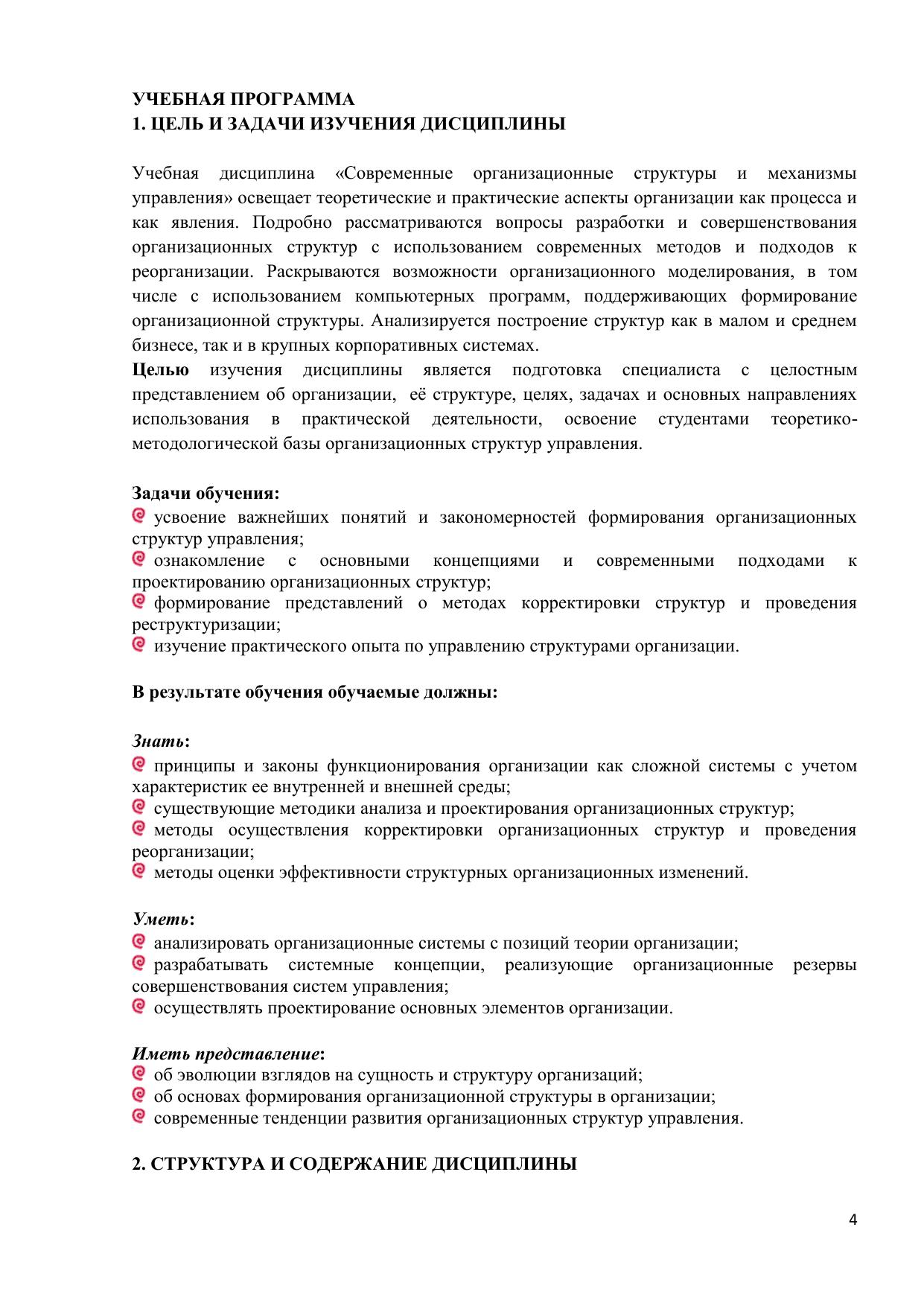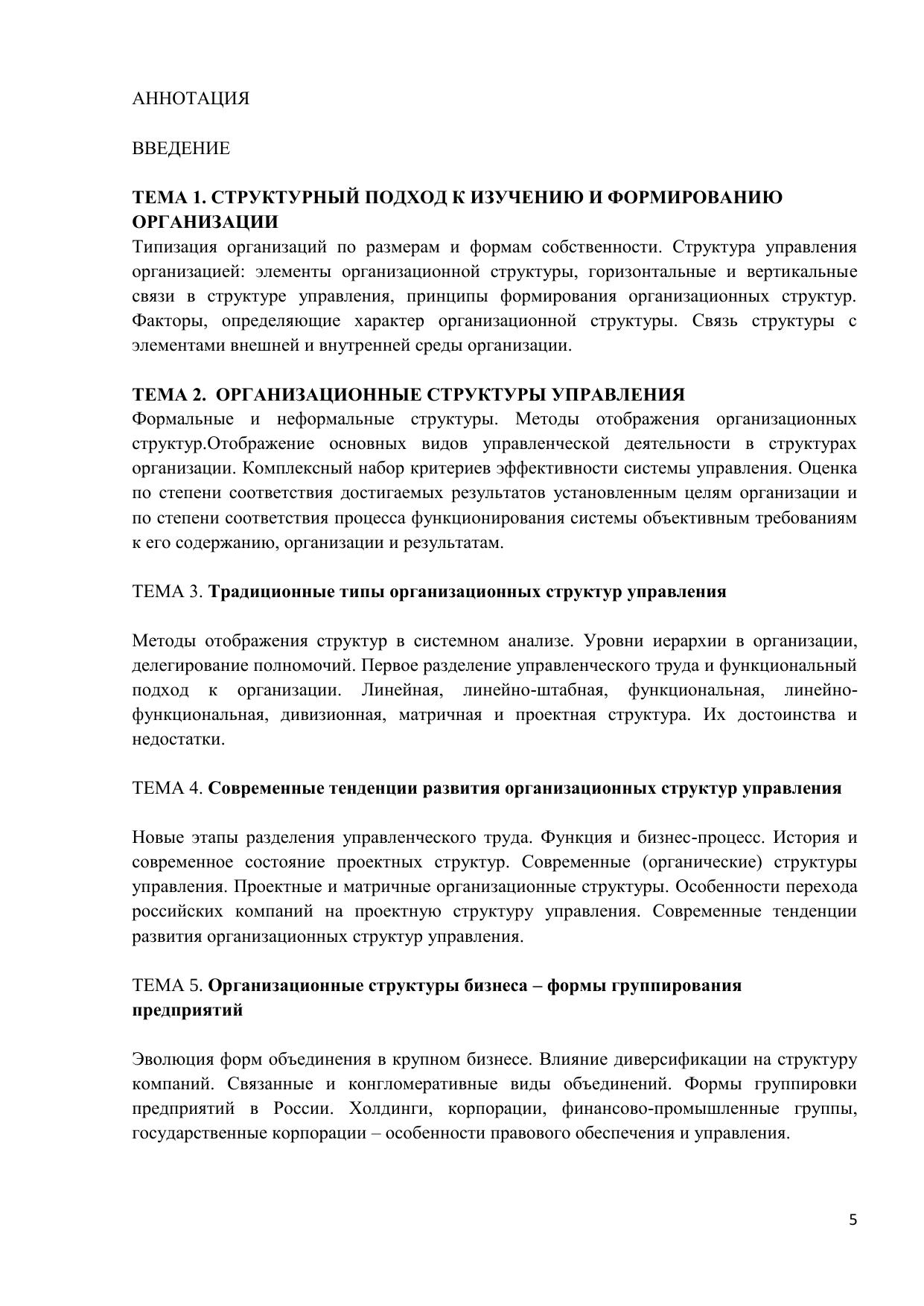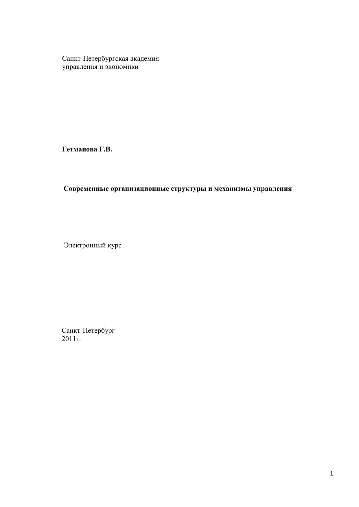 Организационная структура управления является одним из элементов внутренней среды компании, наряду с целями, задачами, персоналом и технологией. Особенностью этого элемента является его высокая управляемость: структуру можно изменить приказом руководителя. Но смена структуры должна учитывать множество факторов: этап жизненного цикла компании, ее стратегию, динамичность и сложность внешней среды. При разработке концепции структуры управления необходимо ответить на множество вопросов. Как создать такой каркас организации, который обеспечит ее долгое и успешное существование? В чем секрет эффективного распределения служебных обязанностей? Как наладить действенную систему контроля, избежав при этом излишней бюрократизации? Грамотные ответы на эти вопросы позволят быть организации эффективной. Адекватная система управления является индикатором уровня квалификации руководителей и их деловой культуры. В последние годы организации претерпевают серьезные перемены. Наряду с традиционными классическими организациями, построенными по бюрократическому принципу и основанными на вертикальном и горизонтальном разделении управленческого труда, появились структуры иного типа. Их управление меньше зависит от иерархии, распределения полномочий и ответственности. Принципы, которые хорошо известны менеджерам, такие как, например, единоначалие или норма управляемости, в этих организациях не являются определяющими. Информационные технологии, глобализация рынков – открывают новую страницу в организационном дизайне. Все эти современные тенденции должны быть известны специалистам в области управления. Курс предназначен для студентов очной формы обучения по направлению «Менеджмент». Материалы электронного курса возможно также использовать для слушателей программ переподготовки и повышения квалификации.