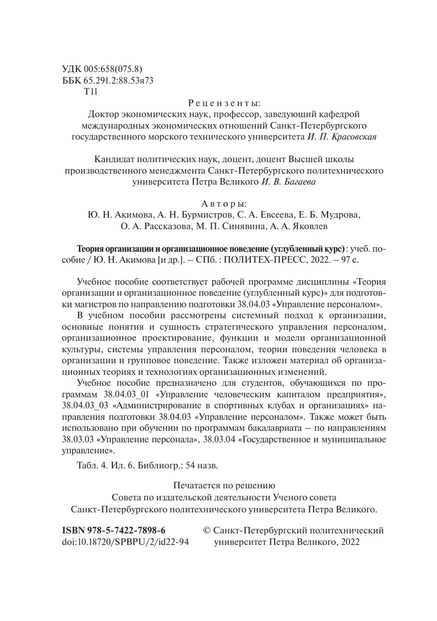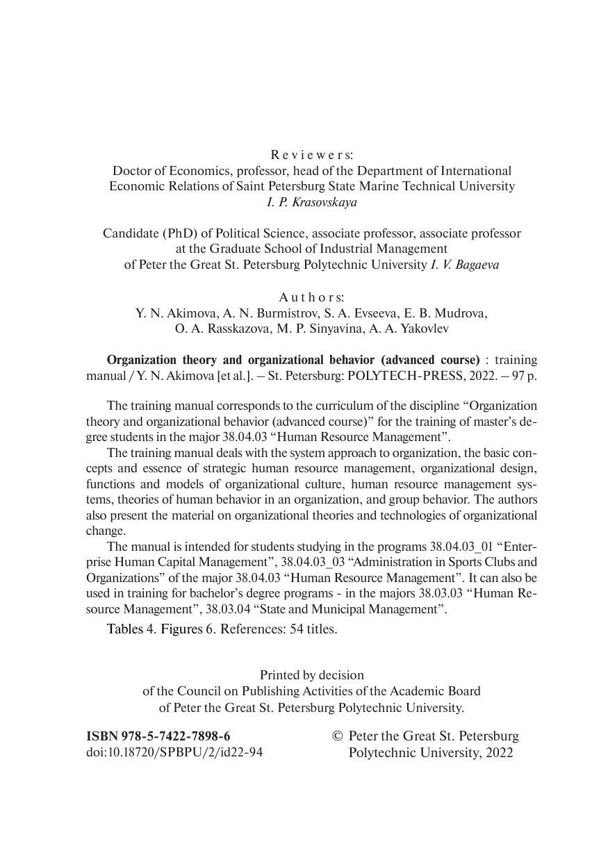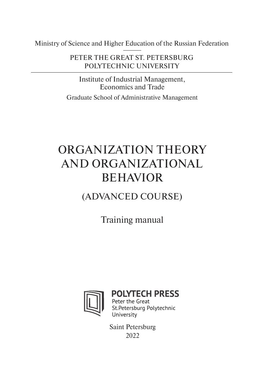Учебное пособие соответствует рабочей программе дисциплины «Теория организации и организационное поведение (углубленный курс)» для подготовки магистров по направлению подготовки 38.04.03 «Управление персоналом». В учебном пособии рассмотрены системный подход к организации, основные понятия и сущность стратегического управления персоналом, организационное проектирование, функции и модели организационной культуры, системы управления персоналом, теории поведения человека в организации и групповое поведение. Также изложен материал об организационных теориях и технологиях организационных изменений. Учебное пособие предназначено для студентов, обучающихся по программам 38.04.03_01 «Управление человеческим капиталом предприятия», 38.04.03_03 «Администрирование в спортивных клубах и организациях» направления подготовки 38.04.03 «Управление персоналом». Также может быть использовано при обучении по программам бакалавриата – по направлениям 38.03.03 «Управление персонала», 38.03.04 «Государственное и муниципальное управление».