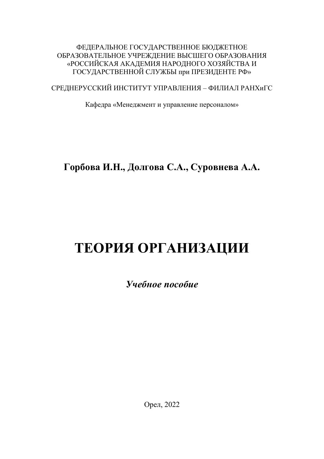 Учебное пособие ориентировано на развитие теоретической и практической подготовки будущих специалистов в области менеджмента. Учебное пособие раскрывает сущность, теоретические и практические аспекты организационной деятельности хозяйствующих субъектов, в нем рассматривается место теории организации в системе наук, а также тенденции ее развития, организационные принципы, структурные схемы, концептуальные подходы к рассмотрению организации и построению ее структуры. Учебное пособие предназначено для самостоятельной работы обучающихся по направлению 38.03.02 «Менеджмент» очной и очнозаочной форм обучения, подготовлено в соответствии с требованиями ОП.