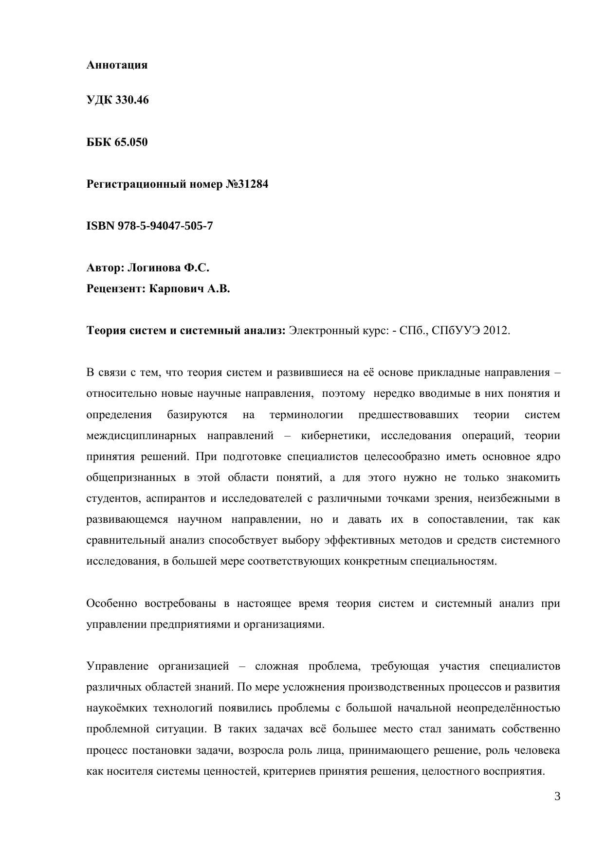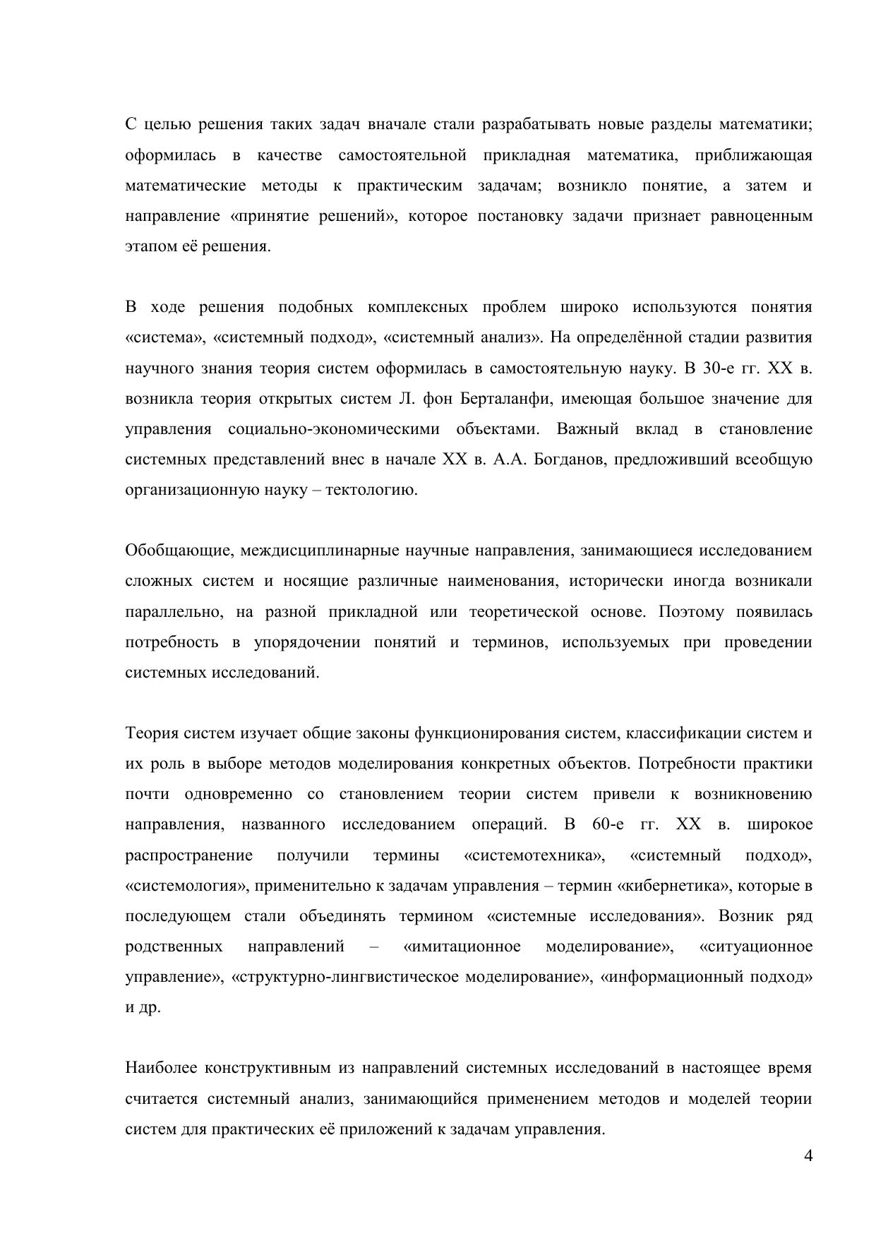 В связи с тем, что теория систем и развившиеся на её основе прикладные направления – относительно новые научные направления, поэтому нередко вводимые в них понятия и определения, базируются на терминологии предшествовавших теории систем междисциплинарных направлений – кибернетики, исследования операций, теории принятия решений. При подготовке специалистов целесообразно иметь основное ядро общепризнанных в этой области понятий, а для этого нужно не только знакомить студентов, аспирантов и исследователей с различными точками зрения, неизбежными в развивающемся научном направлении, но и давать их в сопоставлении, так как сравнительный анализ способствует выбору эффективных методов и средств системного исследования, в большей мере соответствующих конкретным специальностям. Особенно востребованы в настоящее время теория систем и системный анализ при управлении предприятиями и организациями. Управление организацией – сложная проблема, требующая участия специалистов различных областей знаний. По мере усложнения производственных процессов и развития наукоёмких технологий появились проблемы с большой начальной неопределённостью проблемной ситуации. В таких задачах всё большее место стал занимать собственно процесс постановки задачи, возросла роль лица, принимающего решение, роль человека как носителя системы ценностей, критериев принятия решения, целостного восприятия. С целью решения таких задач вначале стали разрабатывать новые разделы математики оформилась в качестве самостоятельной прикладная математика, приближающая математические методы к практическим задачам возникло понятие, а затем и направление «принятие решений», которое постановку задачи признает равноценным этапом её решения. В ходе решения подобных комплексных проблем широко используются понятия «система», «системный подход», «системный анализ». На определённой стадии развития научного знания теория систем оформилась в самостоятельную науку. В 30-е гг. XX в. возникла теория открытых систем Л. фон Берталанфи, имеющая большое значение для управления социально-экономическими объектами. Важный вклад в становление системных представлений внес в начале XX в. А.А. Богданов, предложивший всеобщую организационную науку – тектологию. Обобщающие, междисциплинарные научные направления, занимающиеся исследованием сложных систем и носящие различные наименования, исторически иногда возникали параллельно, на разной прикладной или теоретической основе. Поэтому появилась потребность в упорядочении понятий и терминов, используемых при проведении системных исследований. Теория систем изучает общие законы функционирования систем, классификации систем и их роль в выборе методов моделирования конкретных объектов. Потребности практики почти одновременно со становлением теории систем привели к возникновению направления, названного исследованием операций. В 60-е гг. XX в. широкое распространение получили термины «системотехника», «системный подход», «системология», применительно к задачам управления – термин «кибернетика», которые в последующем стали объединять термином «системные исследования». Возник ряд родственных направлений – «имитационное моделирование», «ситуационное управление», «структурно-лингвистическое моделирование», «инфо