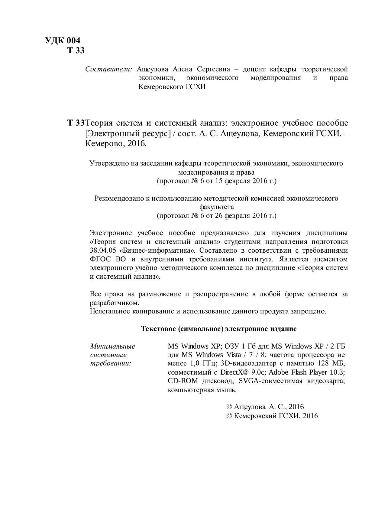 Электронное учебное пособие предназначено для изучения дисциплины «Теория систем и системный анализ» студентами направления подготовки 38.04.05 «Бизнес-информатика». Составлено в соответствии с требованиями ФГОС ВО и внутренними требованиями института. Является элементом электронного учебно-методического комплекса по дисциплине «Теория систем и системный анализ».