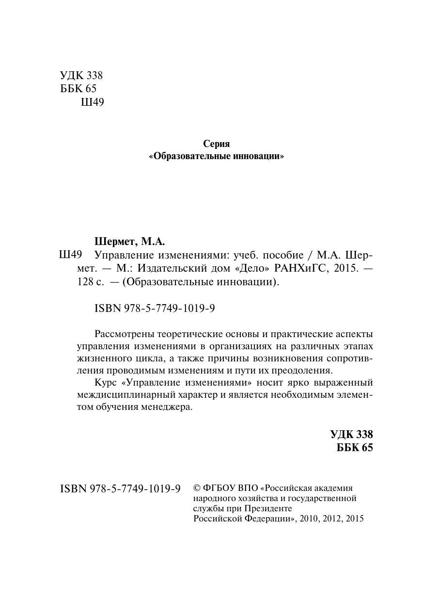 Серия Образовательные инновации. Рассмотрены теоретические основы и практические аспекты управления изменениями в организациях на различных этапах жизненного цикла, а также причины возникновения сопротивления проводимым изменениям и пути их преодоления. Курс «Управление изменениями» носит ярко выраженный междисциплинарный характер и является необходимым элементом обучения менеджера.