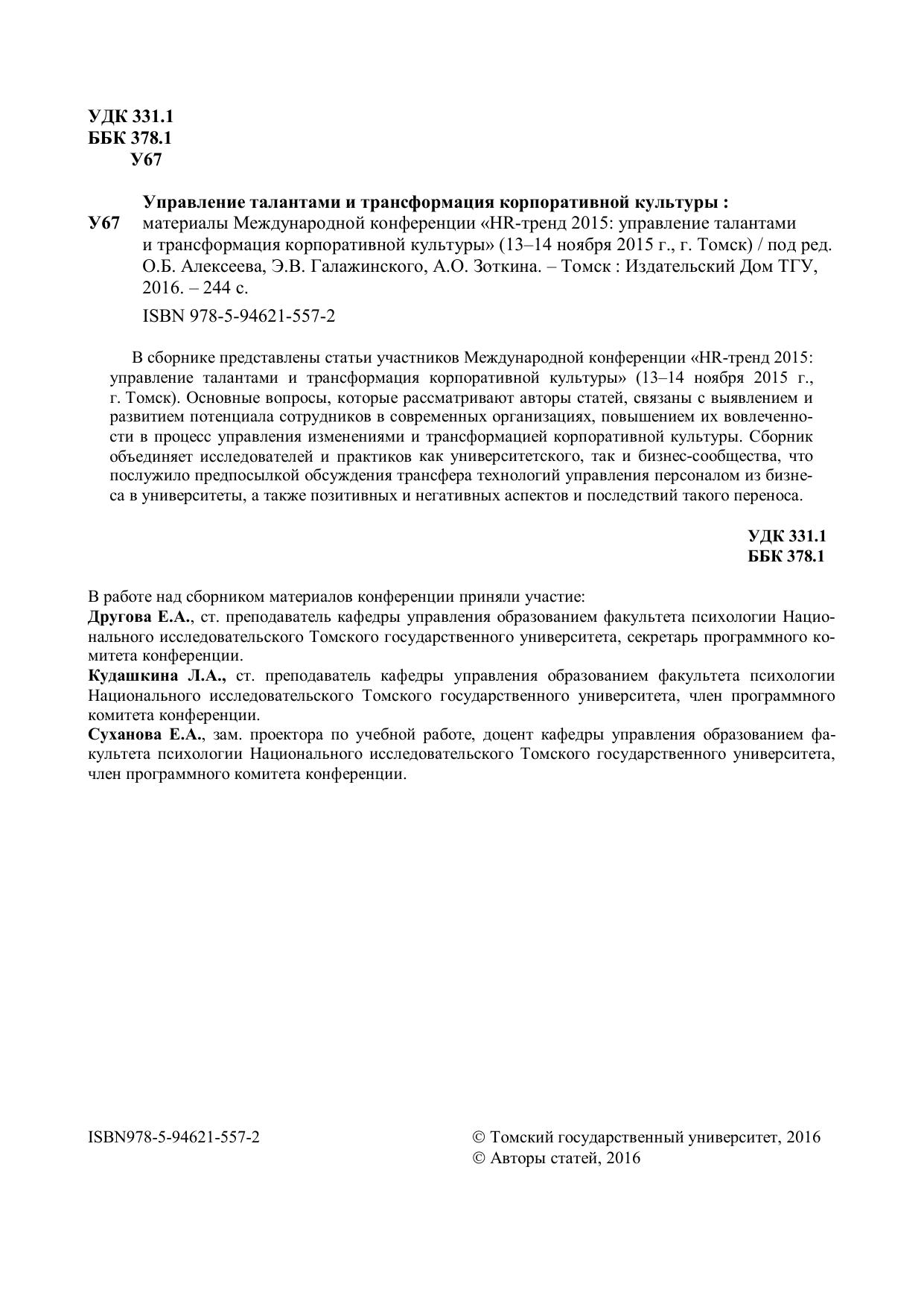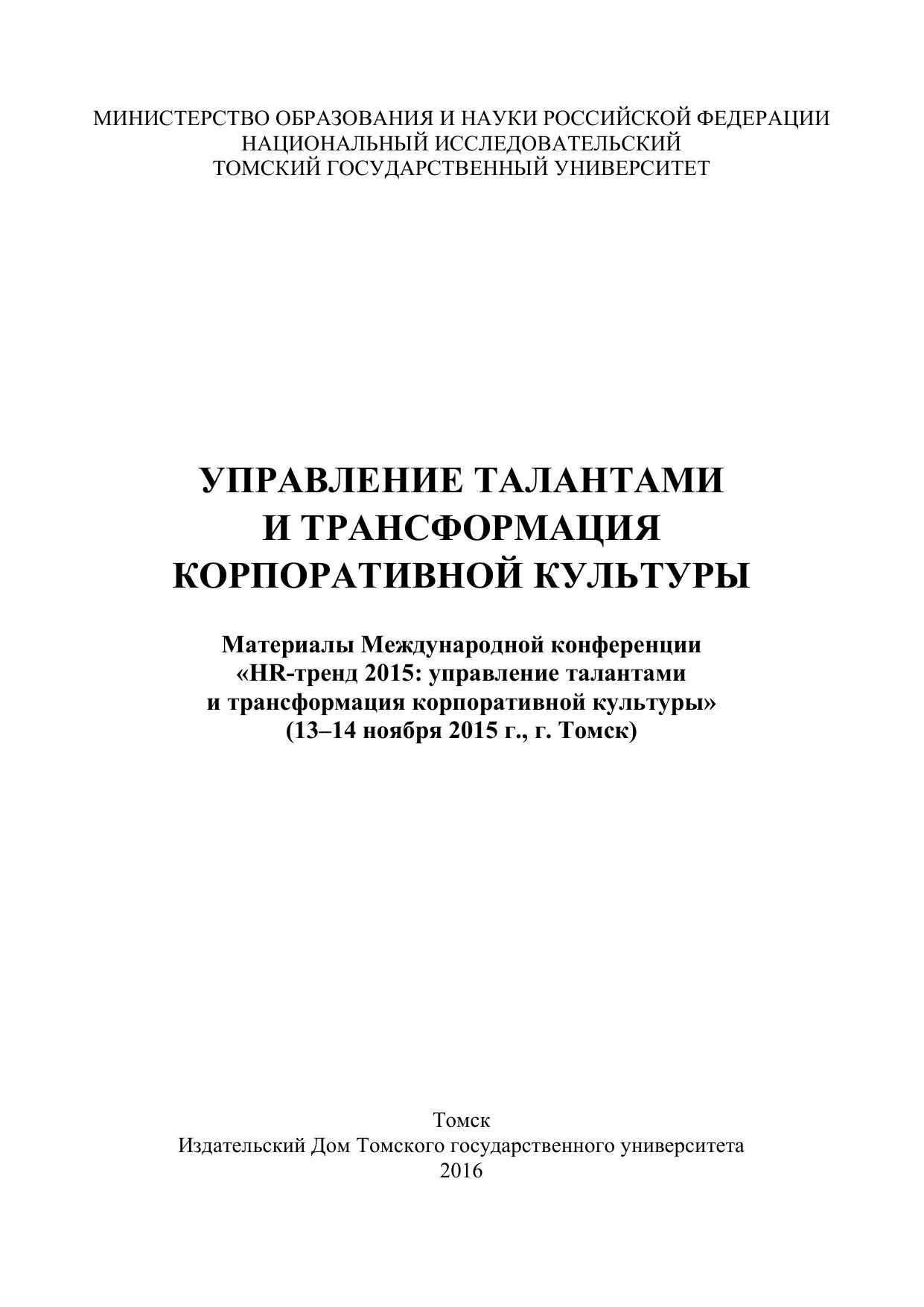 Управление талантами и трансформация корпоративной культуры. Материалы Международной конференции «HR-тренд 2015: управление талантами и трансформация корпоративной культуры» (13–14 ноября 2015 г., г. Томск)