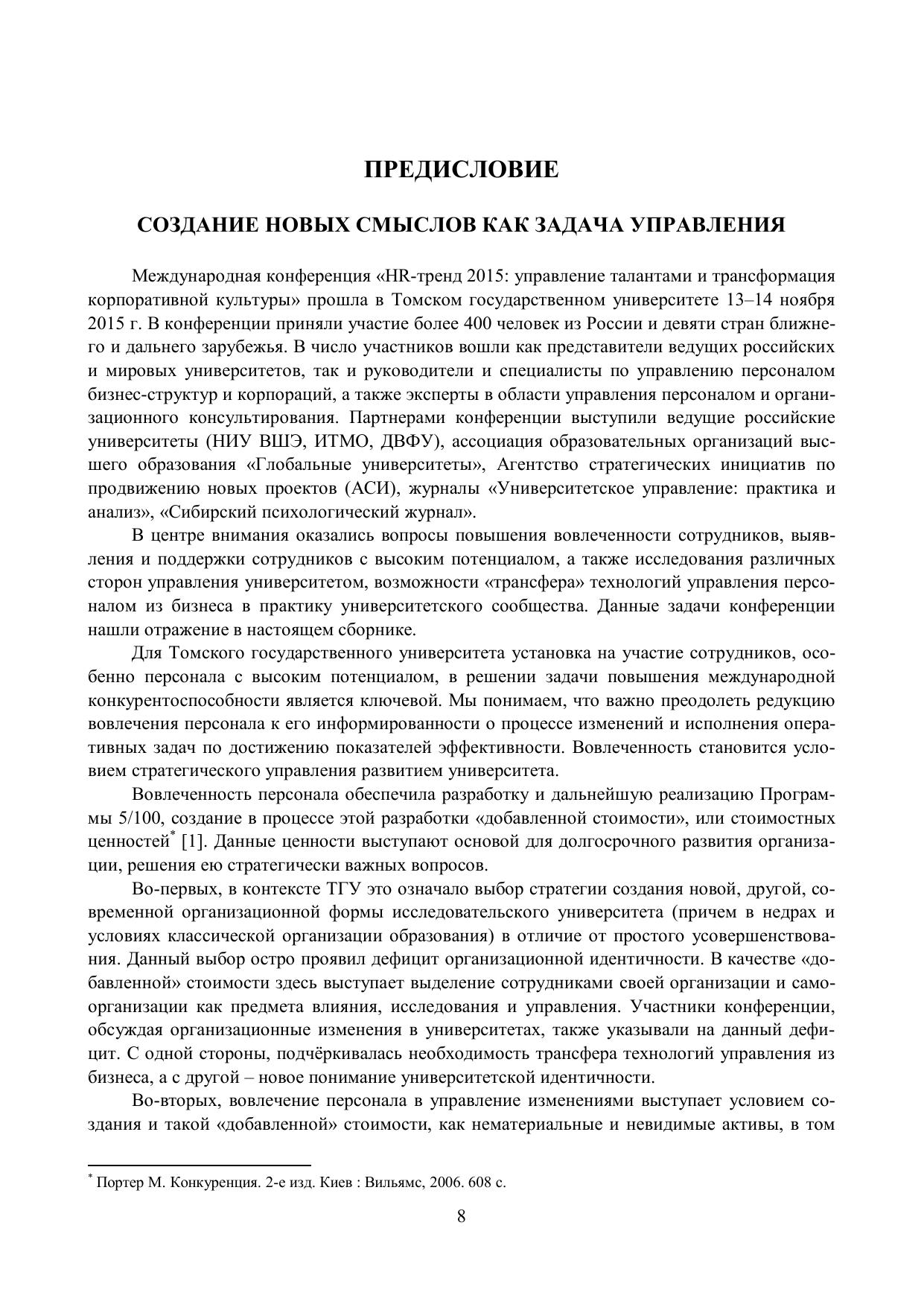 В сборнике представлены статьи участников Международной конференции «HR-тренд 2015: управление талантами и трансформация корпоративной культуры» (13–14 ноября 2015 г., г. Томск). Основные вопросы, которые рассматривают авторы статей, связаны с выявлением и развитием потенциала сотрудников в современных организациях, повышением их вовлеченности в процесс управления изменениями и трансформацией корпоративной культуры. Сборник объединяет исследователей и практиков как университетского, так и бизнес-сообщества, что послужило предпосылкой обсуждения трансфера технологий управления персоналом из бизне- са в университеты, а также позитивных и негативных аспектов и последствий такого переноса.