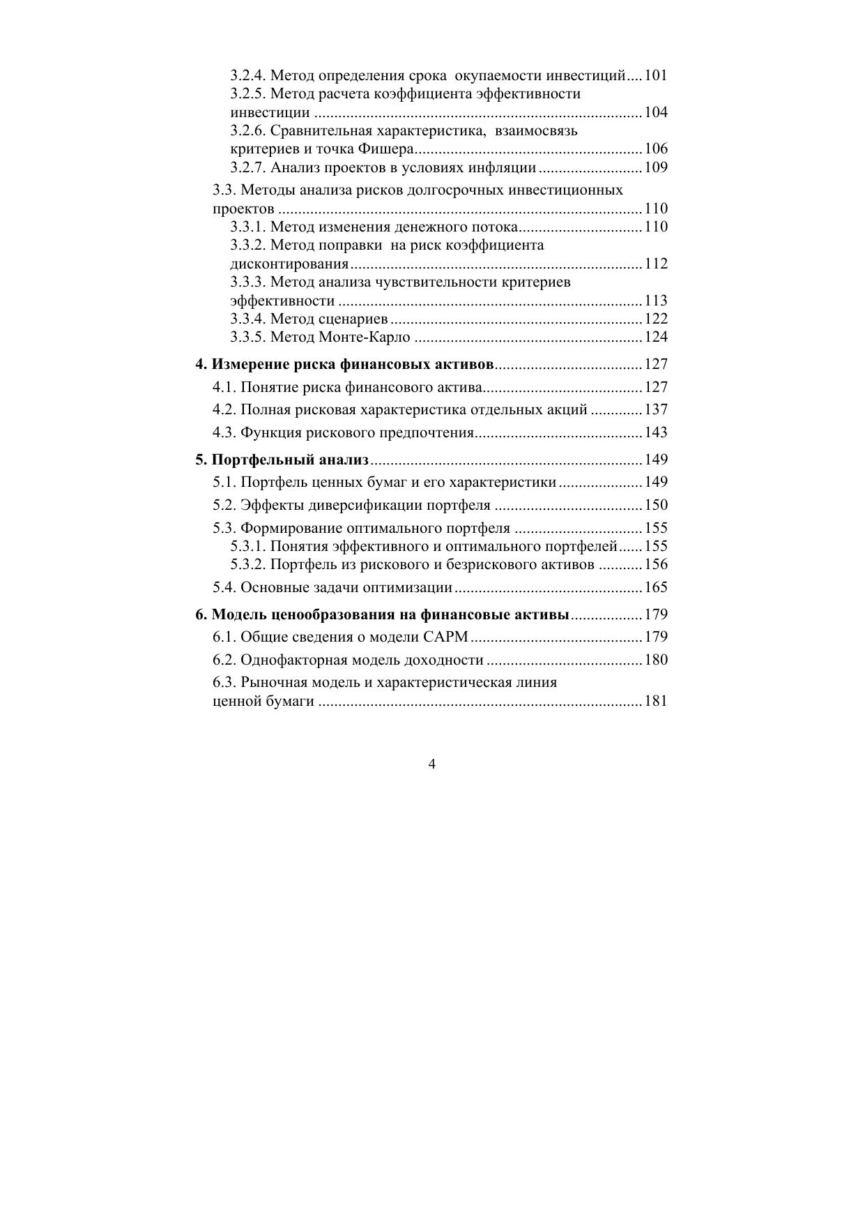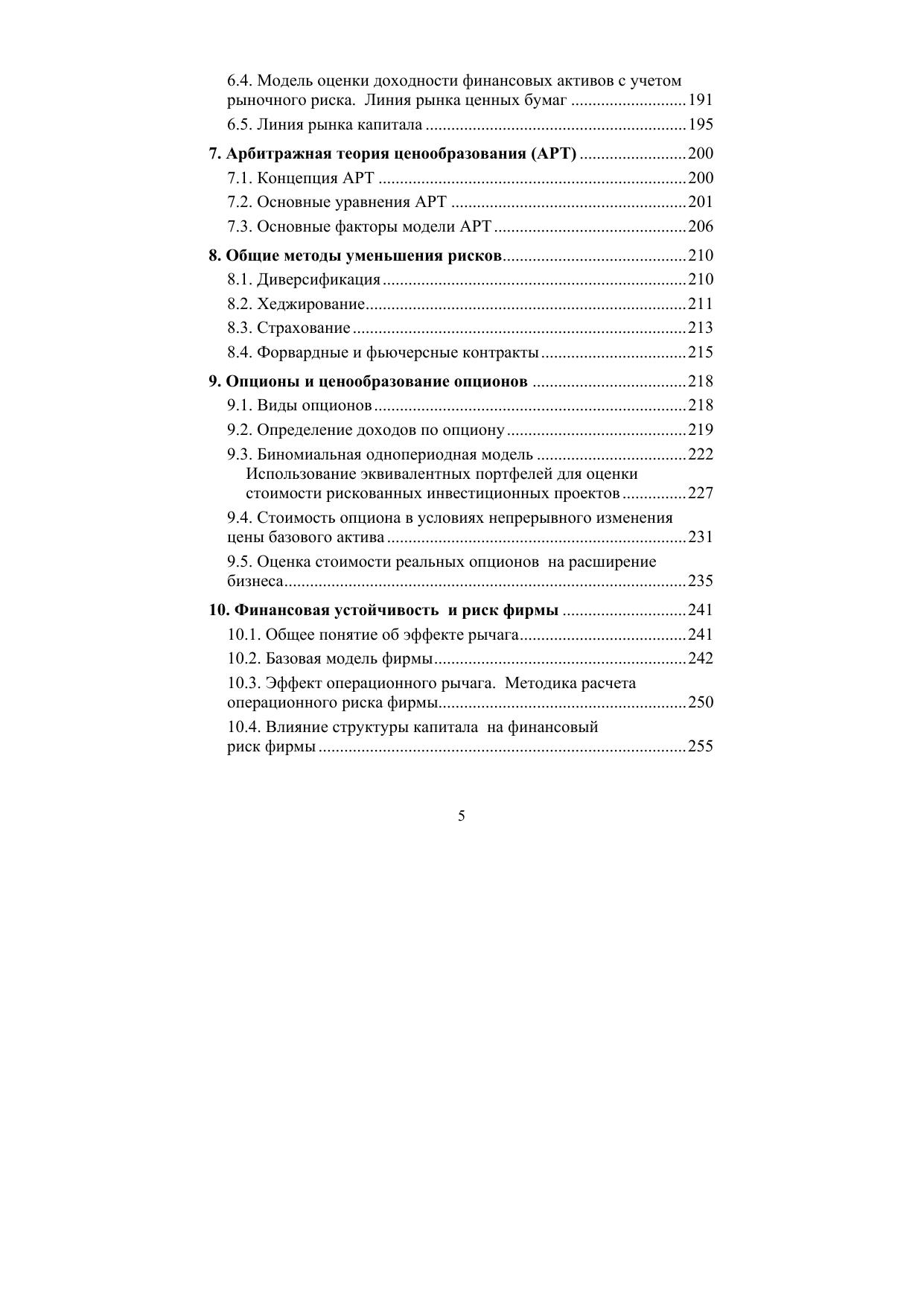 Отдельные темы посвящены определению риска финансовых активов, портфельному анализу и ценообразованию на финансовых рынках, методам снижения риска, в том числе хеджированию с помощью опционов, а также анализу финансовой устойчивости и риска фирмы на основе эффекта рычага.