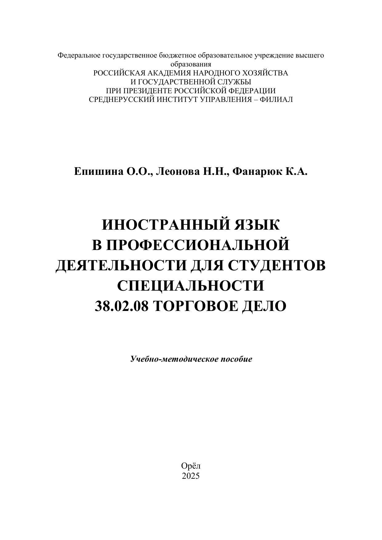 Учебно-методическое пособие «Иностранный язык в профессиональной деятельности для студентов специальности 38.02.08 Торговое дело» по дисциплине «Иностранный язык» (английский) предназначено для студентов колледжа Среднерусского института управления – филиала РАНХиГС, обучающихся по специальности 38.02.08 Торговое дело. Цели пособия соотнесены с требованиями ФГОС СПО к минимуму содержания и уровню подготовки выпускников по вышеуказанной специальности. Они включают приобретение студентами коммуникативной компетенции, уровень которой позволяет использовать иностранный язык практически как профессиональной деятельности, так и для целей самообразования.
