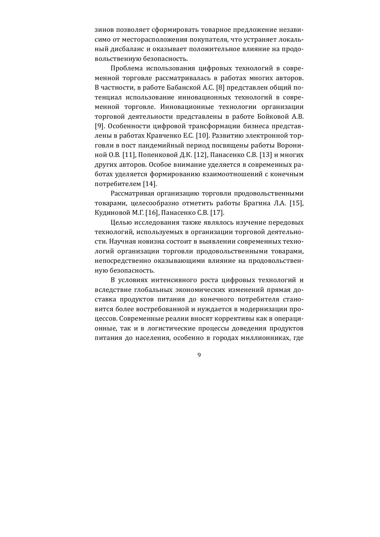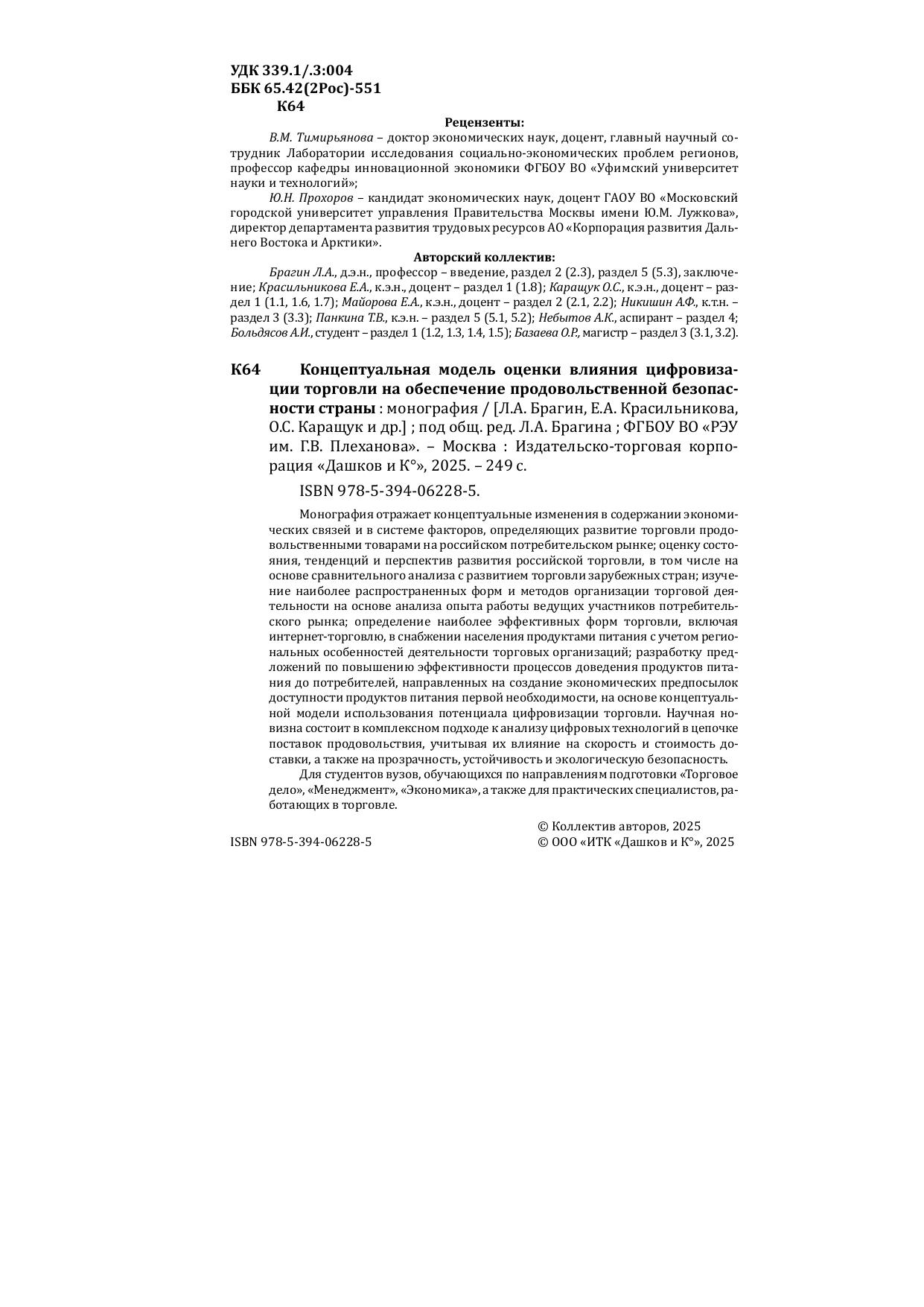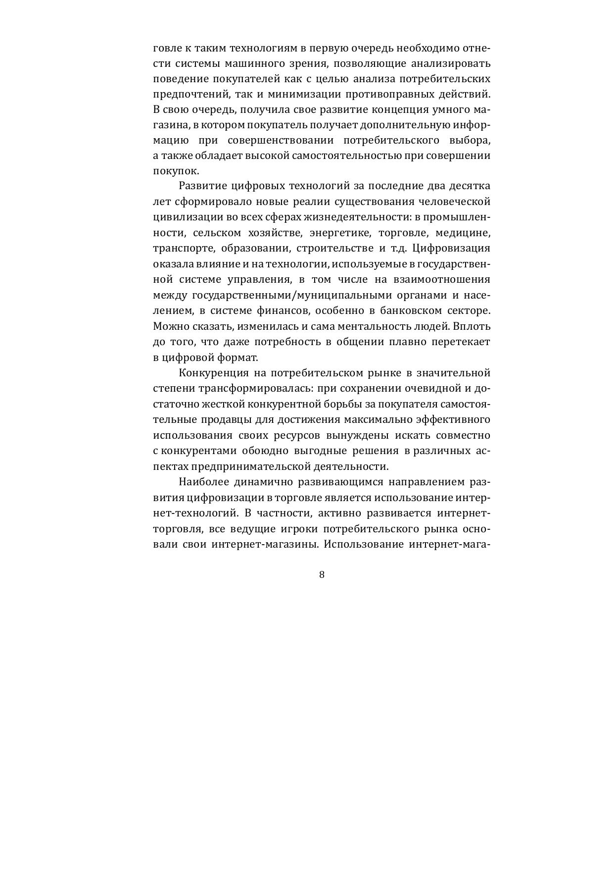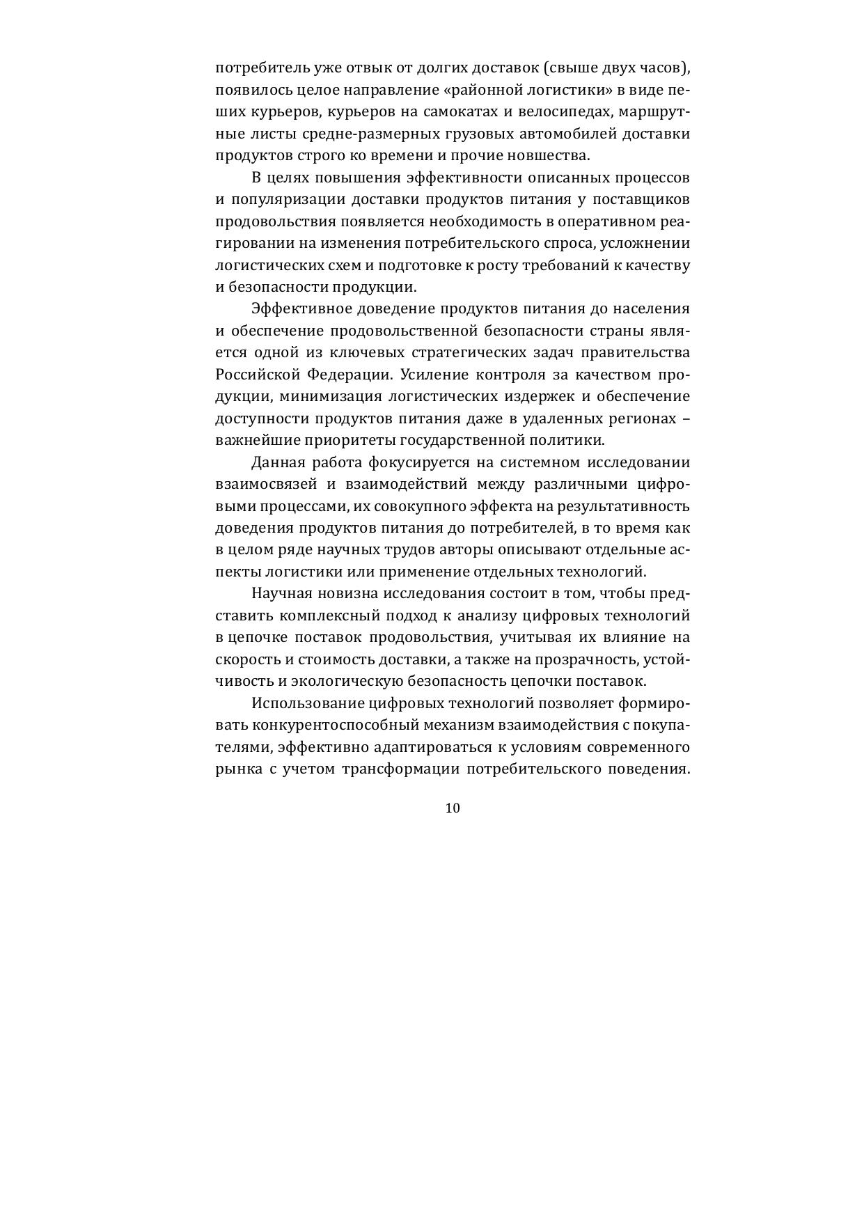 Монография отражает концептуальные изменения в содержании экономических связей и в системе факторов, определяющих развитие торговли продовольственными товарами на российском потребительском рынке; оценку состояния, тенденций и перспектив развития российской торговли, в том числе на основе сравнительного анализа с развитием торговли зарубежных стран; изучение наиболее распространенных форм и методов организации торговой деятельности на основе анализа опыта работы ведущих участников потребительского рынка; определение наиболее эффективных форм торговли, включая интернет-торговлю, в снабжении населения продуктами питания с учетом региональных особенностей деятельности торговых организаций; разработку предложений по повышению эффективности процессов доведения продуктов питания до потребителей, направленных на создание экономических предпосылок доступности продуктов питания первой необходимости, на основе концептуальной модели использования потенциала цифровизации торговли. Научная новизна состоит в комплексном подходе к анализу цифровых технологий в цепочке поставок продовольствия, учитывая их влияние на скорость и стоимость доставки, а также на прозрачность, устойчивость и экологическую безопасность. Для студентов вузов, обучающихся по направлениям подготовки «Торговое дело», «Менеджмент», «Экономика», а также для практических специалистов, работающих в торговле.