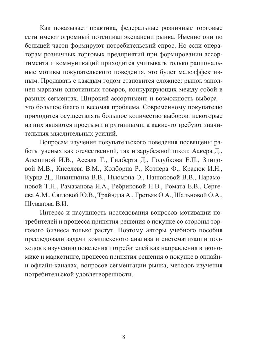 В учебном пособии изложены как классические, так и авторские подходы к изучению поведения потребителей, приведены подходы к сегментации, потребительские тренды и пути их анализа, методы оценки емкости и потенциала рынка. Рассмотрено влияние парадигмальных направлений маркетинговых коммуникаций (нейромаркетинг и эмпирический маркетинг) на процесс принятия решения о покупке, влияние на эмоциональное поведение покупателей технологий мерчандайзинга, интернет-технологий, дистанционной торговли, позволяющих формировать потребительскую лояльность. Для студентов вузов, обучающихся по направлению подготовки «Торговое дело», а также работников предприятий торговли.