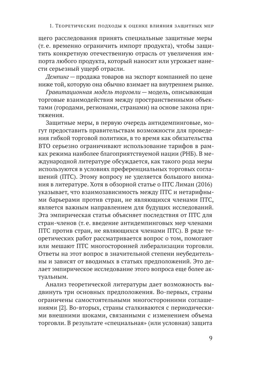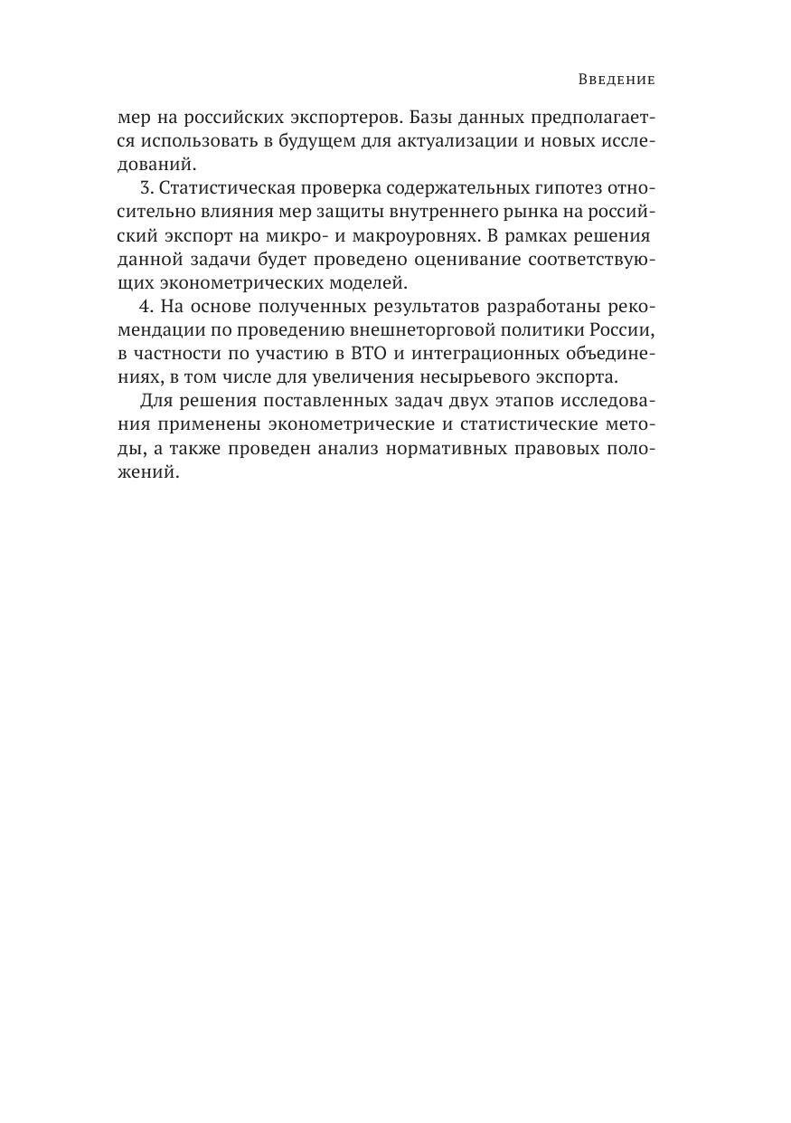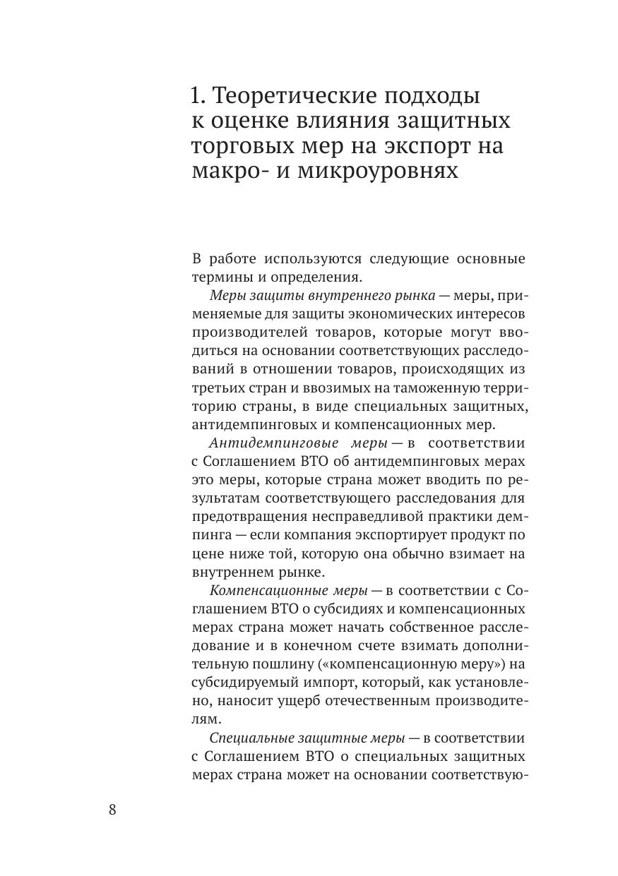 В докладе проводится обзор подходов к оценке влияния защитных мер на торговлю, дана оценка влияния антидемпинговых, компенсационных и специальных мер защиты внутреннего рынка на российских экспортеров, а также в ыявлены возможности для увеличения российского несырьевого экспорта. Авторы использовали эконометрические, статистические методы и анализ нормативных правовых положений на основе баз данных UN COMTRADE, ITC, Всемирного банка, реестра ограничительных ер Минэкономразвития РФ, базы данных корпоративной информации Ruslana. Ключевые слова: защитные меры, антидемпинговые меры, компенсационные меры, специальные защитные меры, гравитационная модель торговли, экспорт, экспортеры, ВТО, фирмы, микроданные, макроданные.