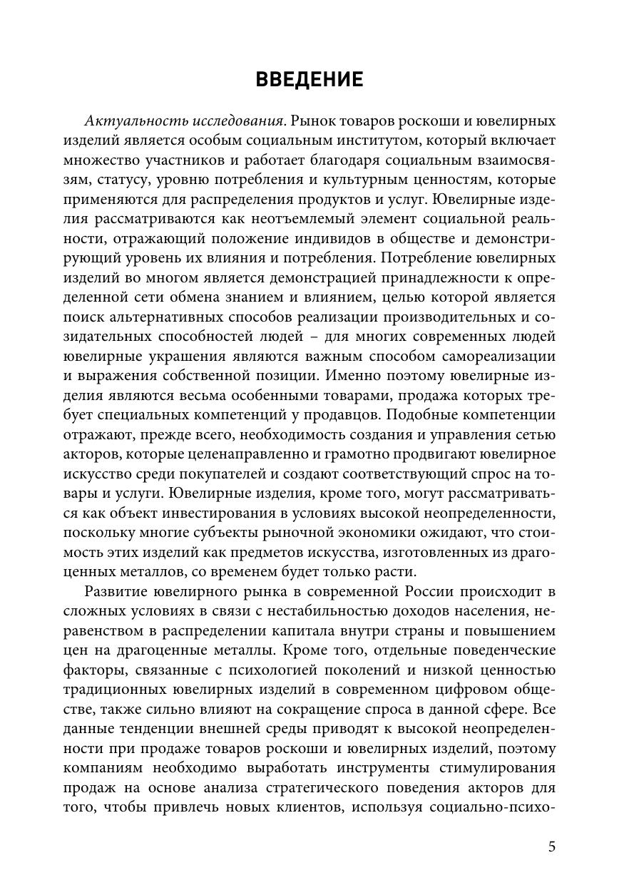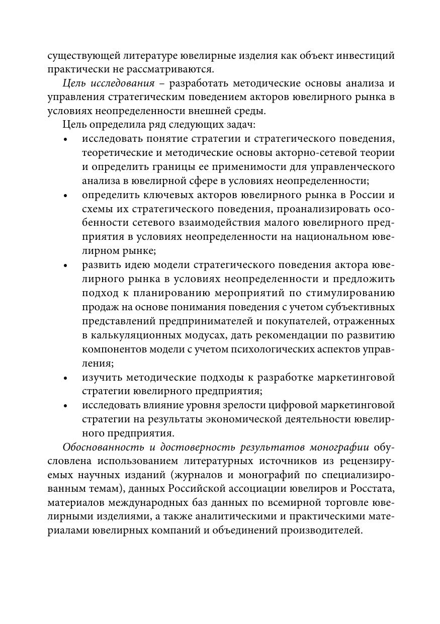 Монография посвящена разработке методических основ анализа и управления стратегическим поведением акторов ювелирного рынка в условиях неопределенности внешней среды. Развитие ювелирного рынка в современной России происходит в сложных условиях в связи с нестабильностью доходов населения, неравенством в распределении капитала внутри страны и повышением цен на драгоценные металлы. Несмотря на высокий интерес к проблемам развития ювелирных рынков, процесс продажи изделий должен быть рассмотрен, прежде всего, как социальный процесс, который полностью погружен в культурный, отношенческий и ценностный контекст, понимание которого способно напрямую повлиять на эффективность привлечения новых клиентов и формирование прибыли компании. В монографии предложен подход к планированию мероприятий по стимулированию продаж на основе понимания поведения с учетом субъективных представлений предпринимателей и покупателей, отраженных в калькуляционных модусах, даны рекомендации по разработке эффективных маркетинговых стратегий. Монография может быть полезна студентам, аспирантам, экономистам, руководителям предприятий и практическим работниками в области стратегического анализа в условиях неопределенности.