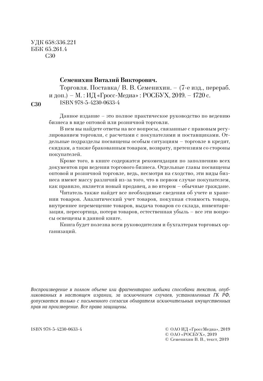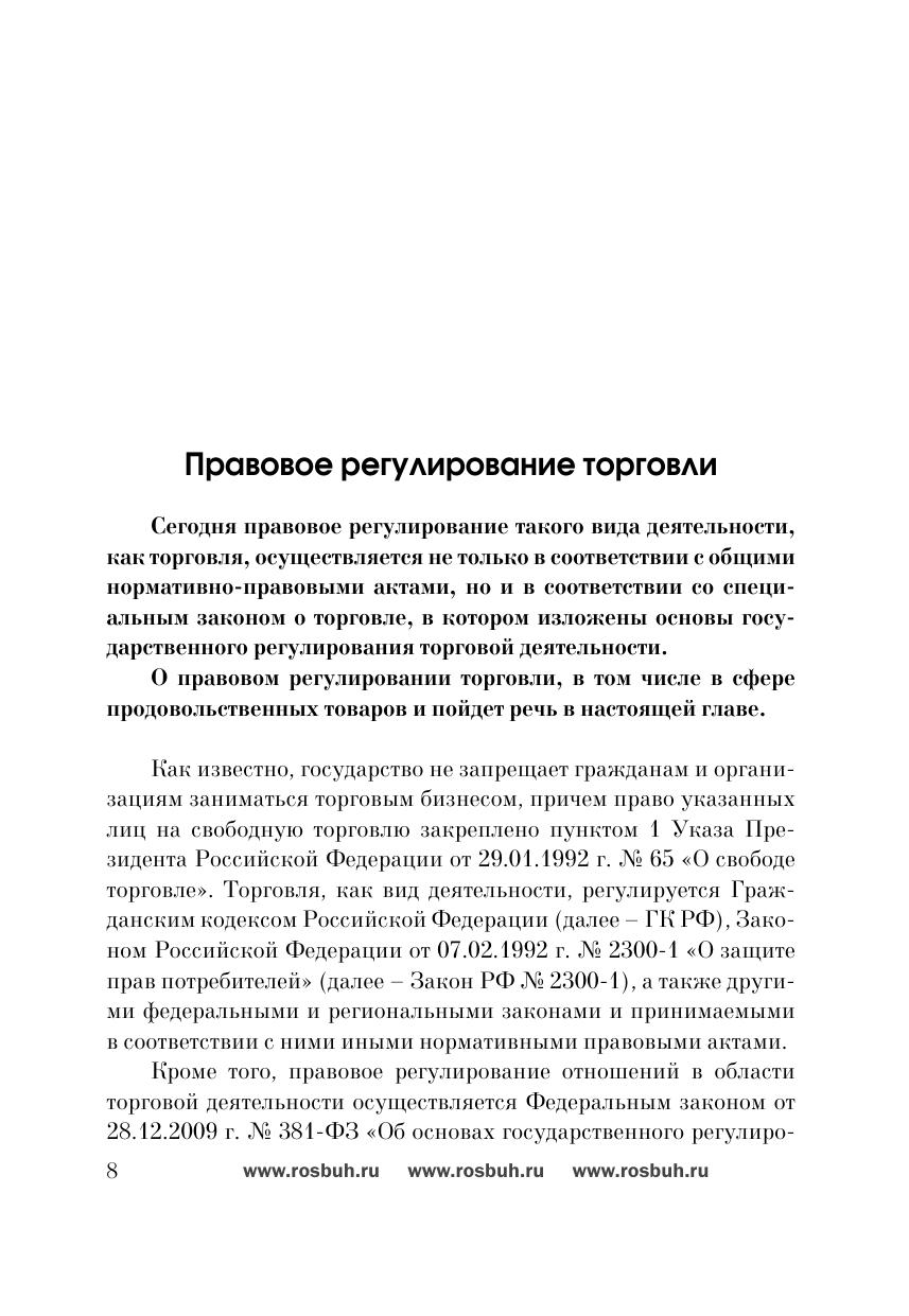 Данное издание – это полное практическое руководство по ведению бизнеса в виде оптовой или розничной торговли. В нем вы найдете ответы на все вопросы, связанные с правовым регулированием торговли, с расчетами с покупателями и поставщиками. Отдельные подразделы посвящены особым ситуациям – торговле в кредит, скидкам, а также бракованным товарам, возврату, претензиям со стороны покупателей. Кроме того, в книге содержатся рекомендации по заполнению всех документов при ведении торгового бизнеса. Отдельные главы посвящены оптовой и розничной торговле, ведь, несмотря на сходство, эти виды бизнеса имеют массу различий из-за того, что в первом случае покупателем, как правило, является новый продавец, а во втором – обычные граждане. Читатель также найдет все необходимые сведения об учете и хранении товаров. Аналитический учет товаров, покупная стоимость товара, внутреннее перемещение товаров, выдача товаров со склада, инвентаризация, пересортица, потери товаров, естественная убыль – все эти вопросы освещены в данной книге. Книга будет полезна всем руководителям и бухгалтерам торговых организаций.