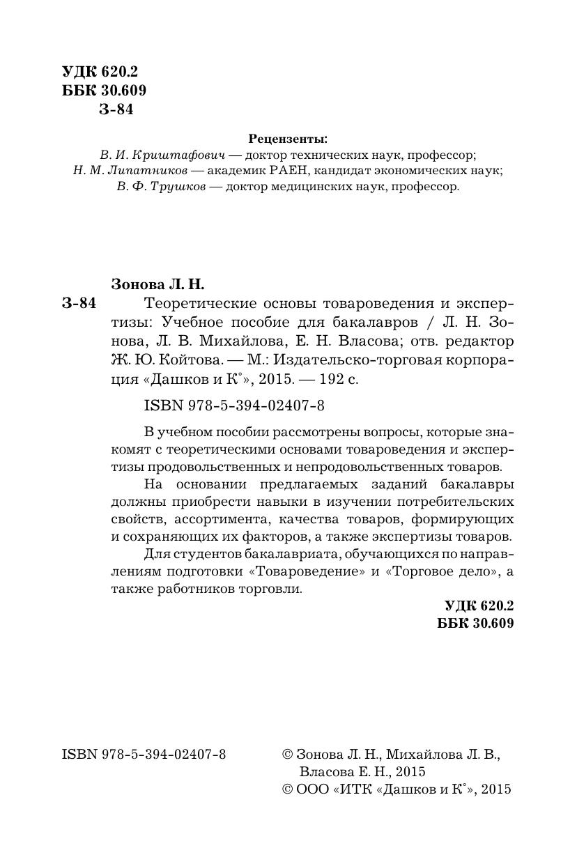 В учебном пособии рассмотрены вопросы, которые знакомят с теоретическими основами товароведения и экспертизы продовольственных и непродовольственных товаров. На основании предлагаемых заданий бакалавры должны приобрести навыки в изучении потребительских свойств, ассортимента, качества товаров, формирующих и сохраняющих их факторов, а также экспертизы товаров. Для студентов бакалавриата, обучающих по направлениям подготовки "Товароведение" и "Торговое дело", а также работников торговли.