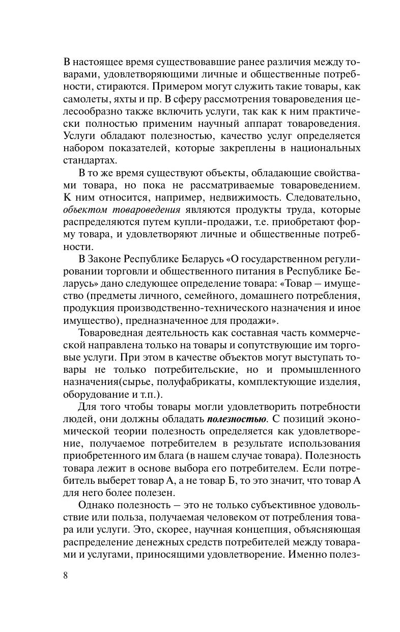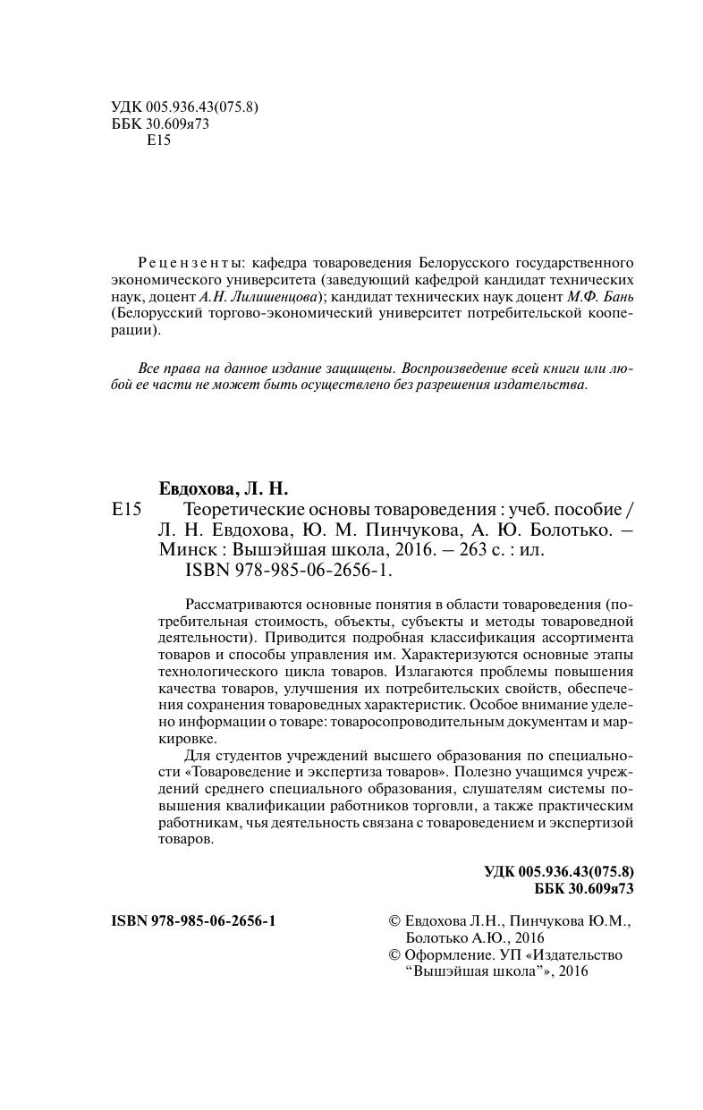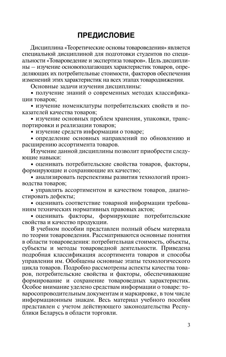 Рассматриваются основные понятия в области товароведения (потребительная стоимость, объекты, субъекты и методы товароведной деятельности). Приводится подробная классификация ассортимента товаров и способы управления им. Характеризуются основные этапы технологического цикла товаров. Излагаются проблемы повышения качества товаров, улучшения их потребительских свойств, обеспечения сохранения товароведных характеристик. Особое внимание уделено информации о товаре: товаросопроводительным документам и маркировке. Для студентов учреждений высшего образования по специальности «Товароведение и экспертиза товаров». Полезно учащимся учреждений среднего специального образования, слушателям системы повышения квалификации работников торговли, а также практическим работникам, чья деятельность связана с товароведением и экспертизой товаров.